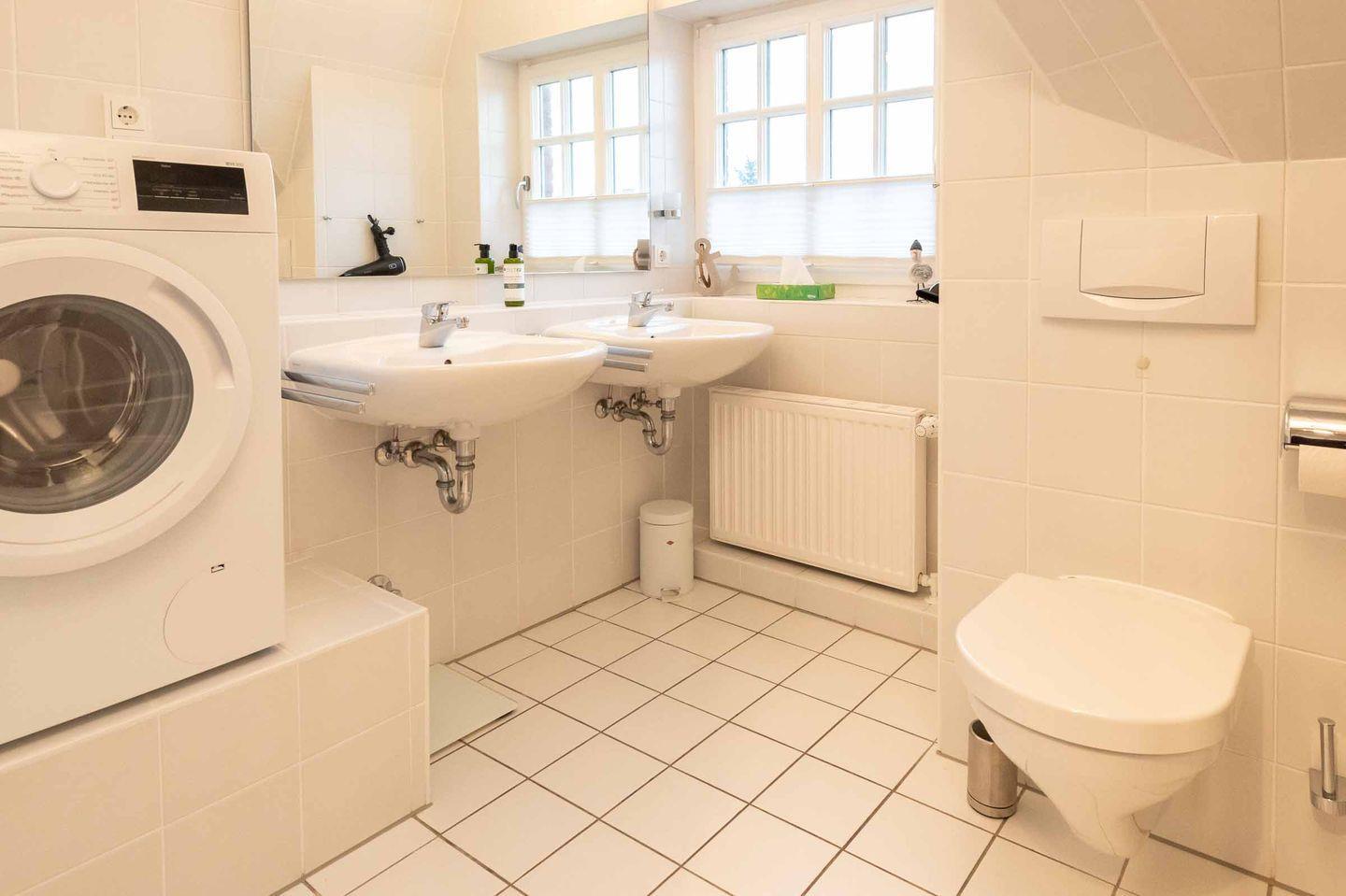 Badezimmer: Großzügiges und helles Bad mit Dusche, Doppelwaschbecken, Waschmaschine und Fenster.