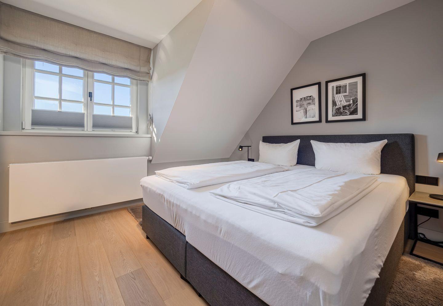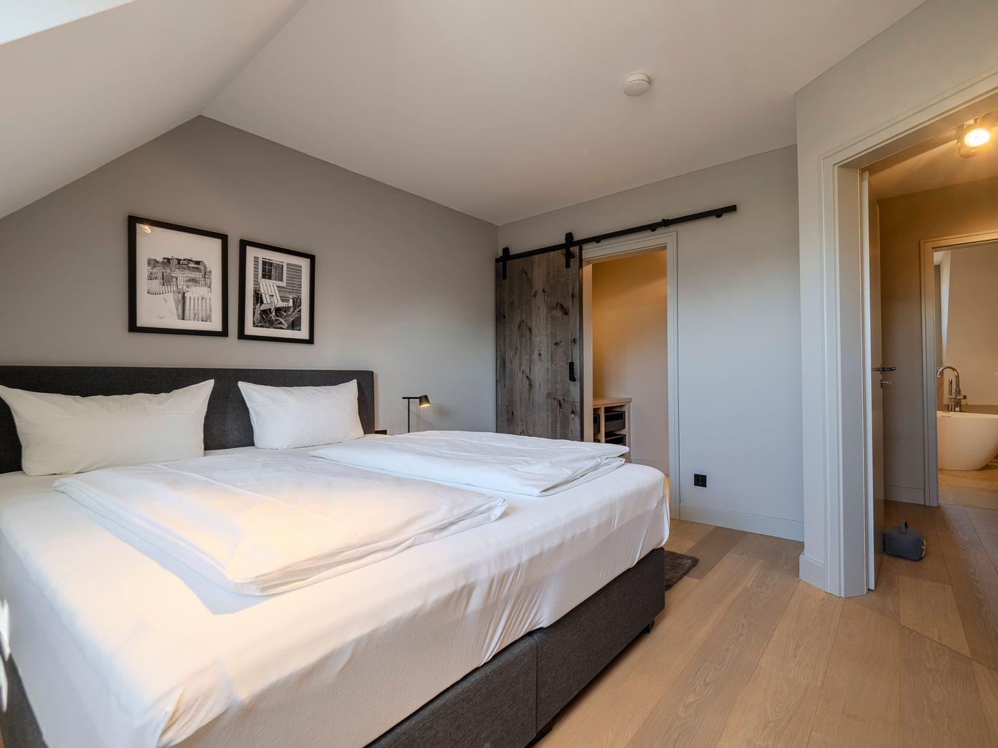 Zwei Doppelschlafzimmer, die beide über ein TV-Gerät, Hotelsafe, Verdunkelungsmöglichkeiten für die Fenster und Stauraum in Form von Kommoden, Garderoben oder Einbauschränken für Kleidung und persönliche Dinge verfügen. Das größere Schlafzimmer bietet einen kleinen Schreibbereich, der auch mobiles Arbeiten im Urlaub ermöglicht, einen begehbaren Kleiderschrank und Meerblick.