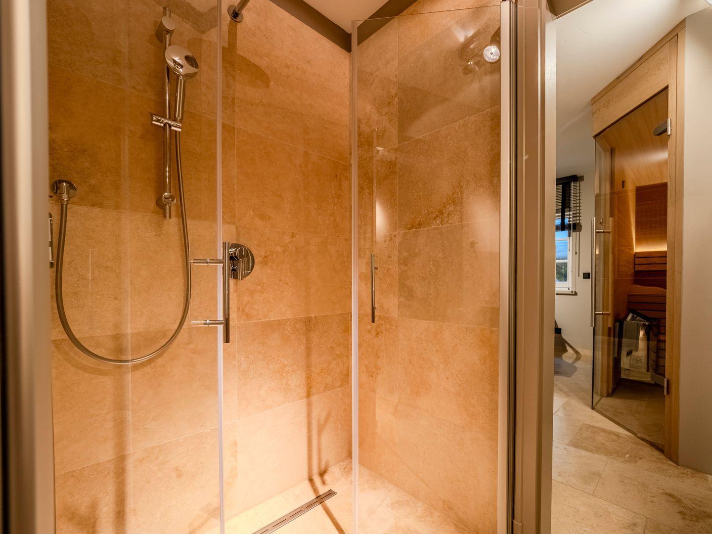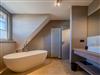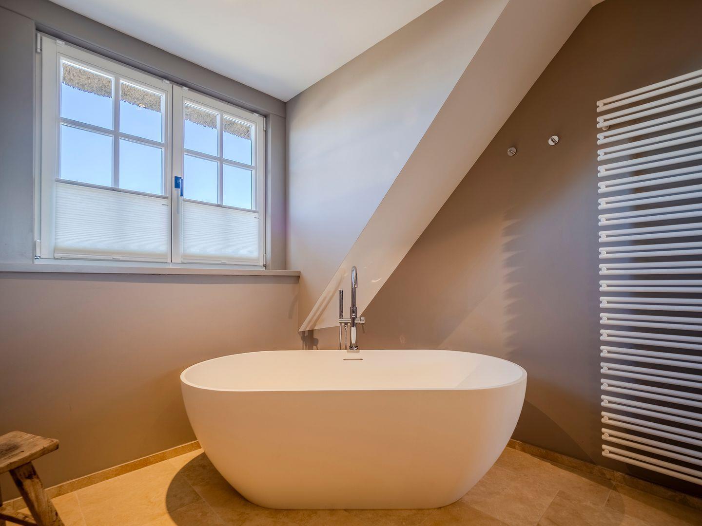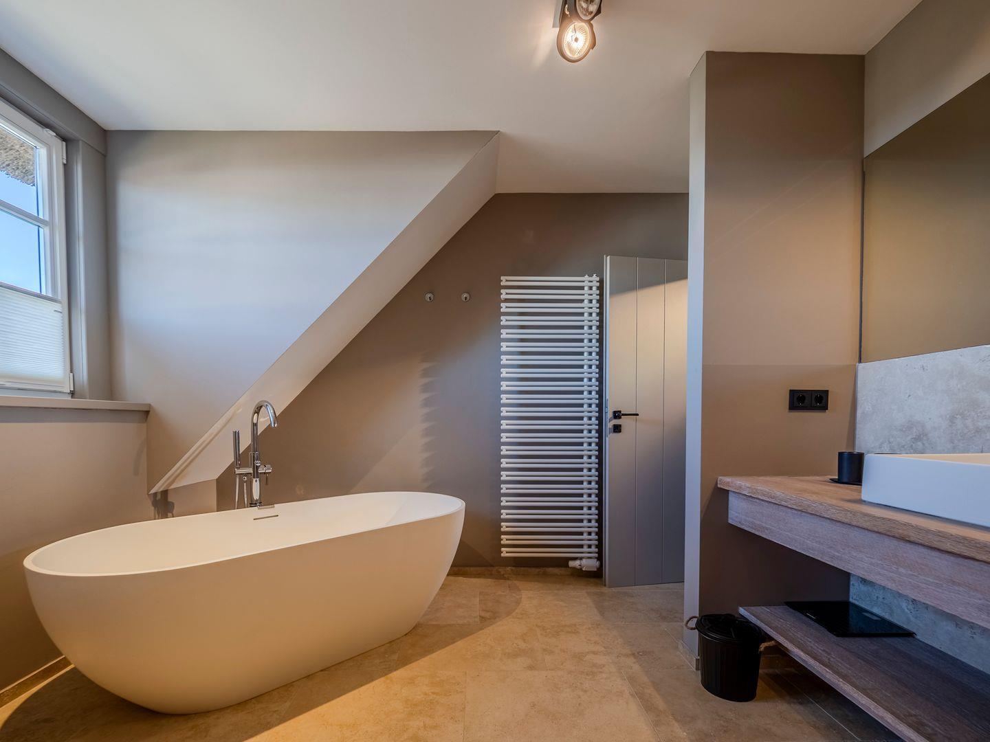 Zwei Badezimmer mit bodengleicher Regendusche, Handtuchtrockner. Eines der Badezimmer verfügt zusätzlich über eine freistehende Badewanne, Radio und Meerblick.
