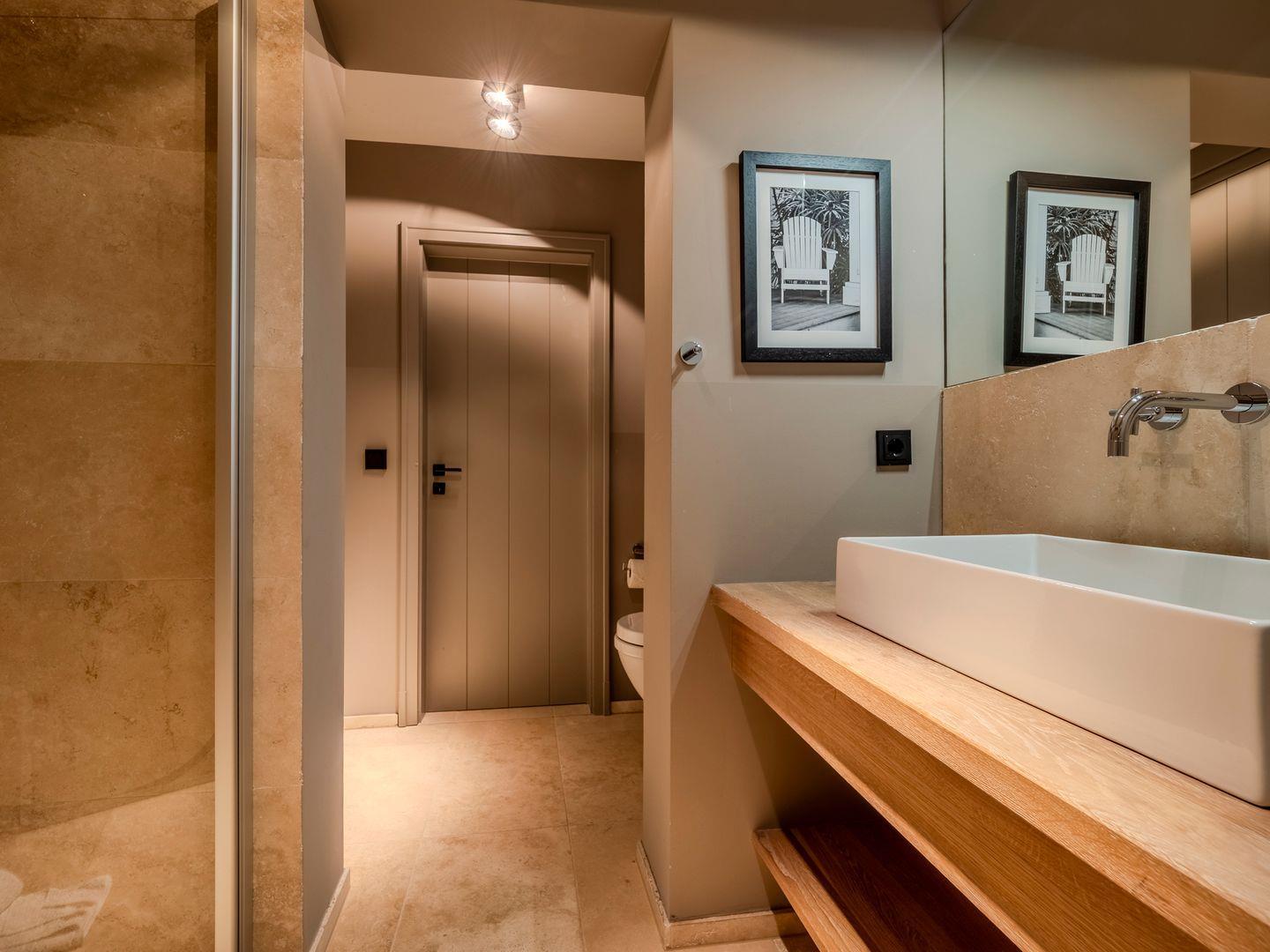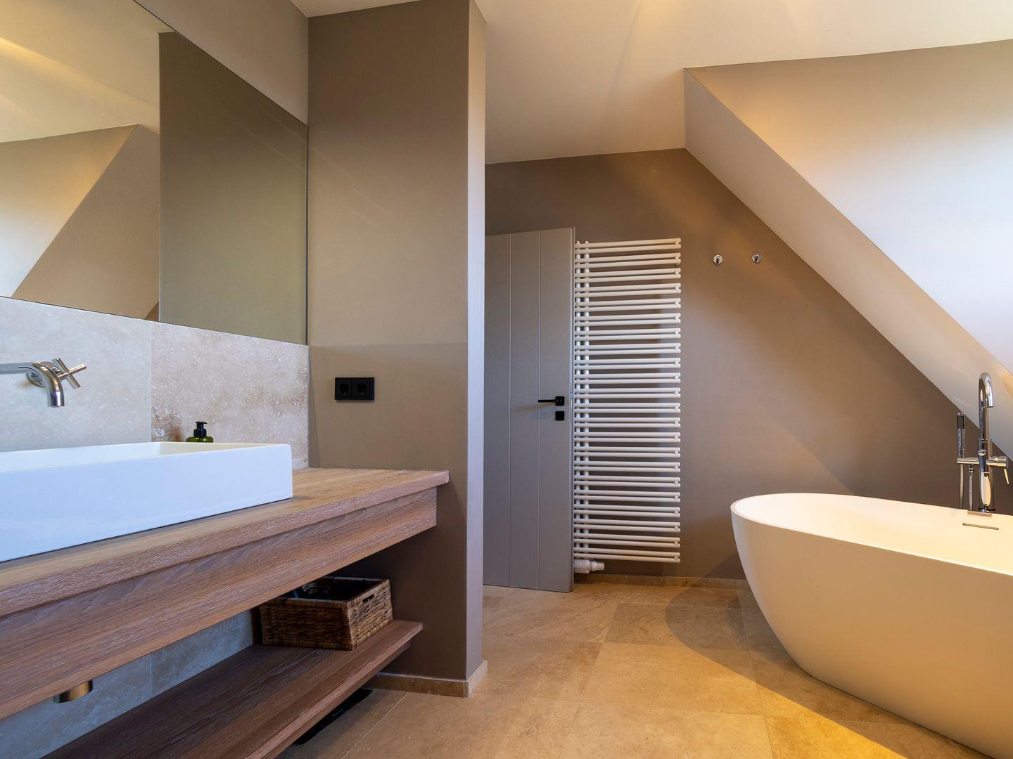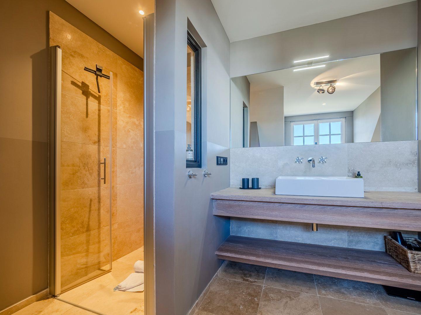 Zwei Badezimmer mit bodengleicher Regendusche, Handtuchtrockner und Fenster. Eines der Badezimmer verfügt zusätzlich über eine freistehende Badewanne, Radio und Meerblick.