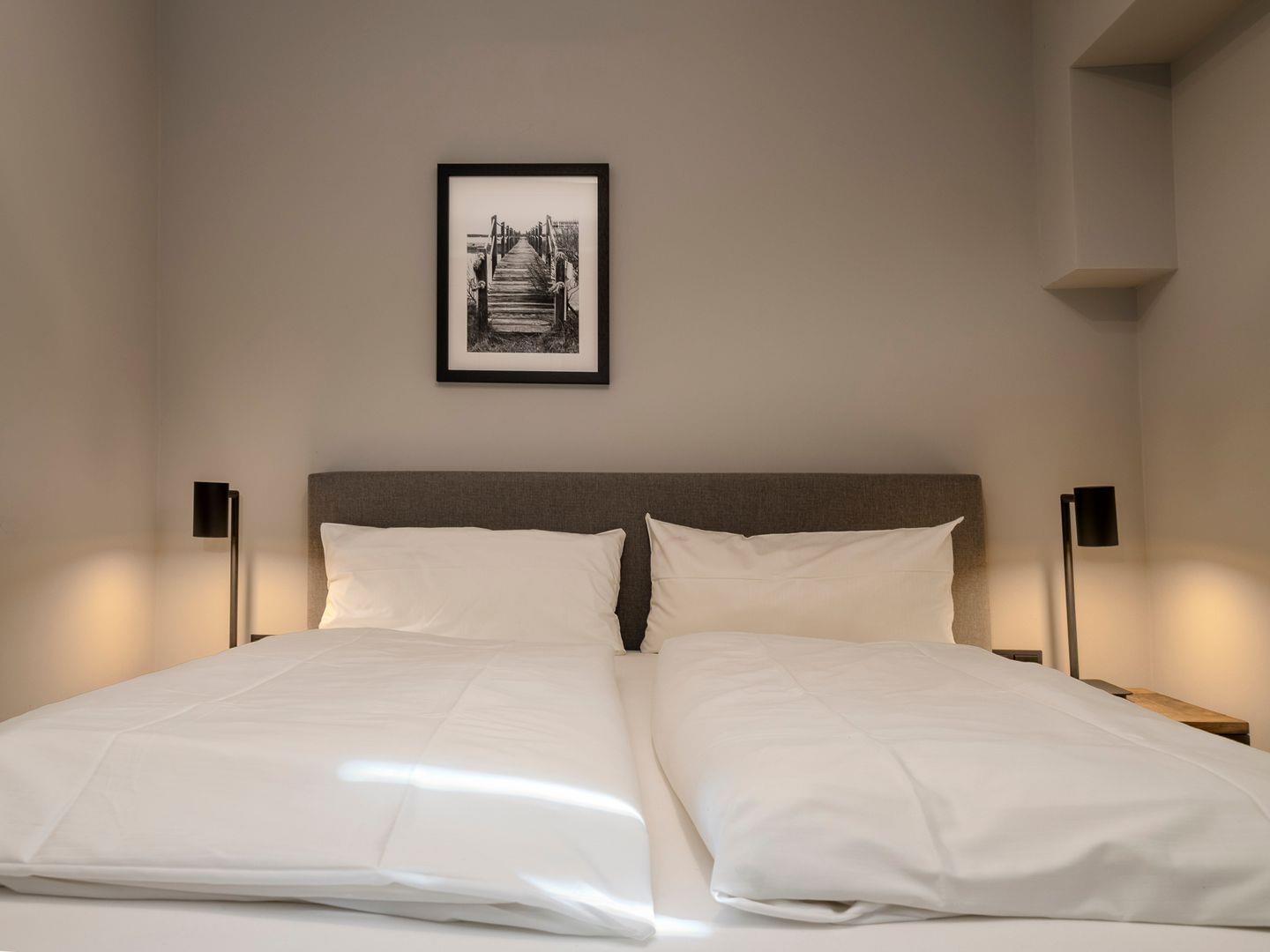 Zwei Doppelschlafzimmer und ein Schlafzimmer mit zwei Einzelbetten (80 cm x 200 cm unter der Dachschrägen - steile Treppe), die sich auch mittig zusammenstellen lassen. Alle Schlafzimmer verfügen über ein TV-Gerät, Hotelsafe, Verdunkelungsmöglichkeiten für die Fenster und Stauraum in Form von Kommoden, Garderoben oder Einbauschränken für Kleidung und persönliche Dinge. Das größte Schlafzimmer bietet einen kleinen Schreibbereich, der auch mobiles Arbeiten im Urlaub ermöglicht, einen begehbaren Kleiderschrank und Meerblick.
