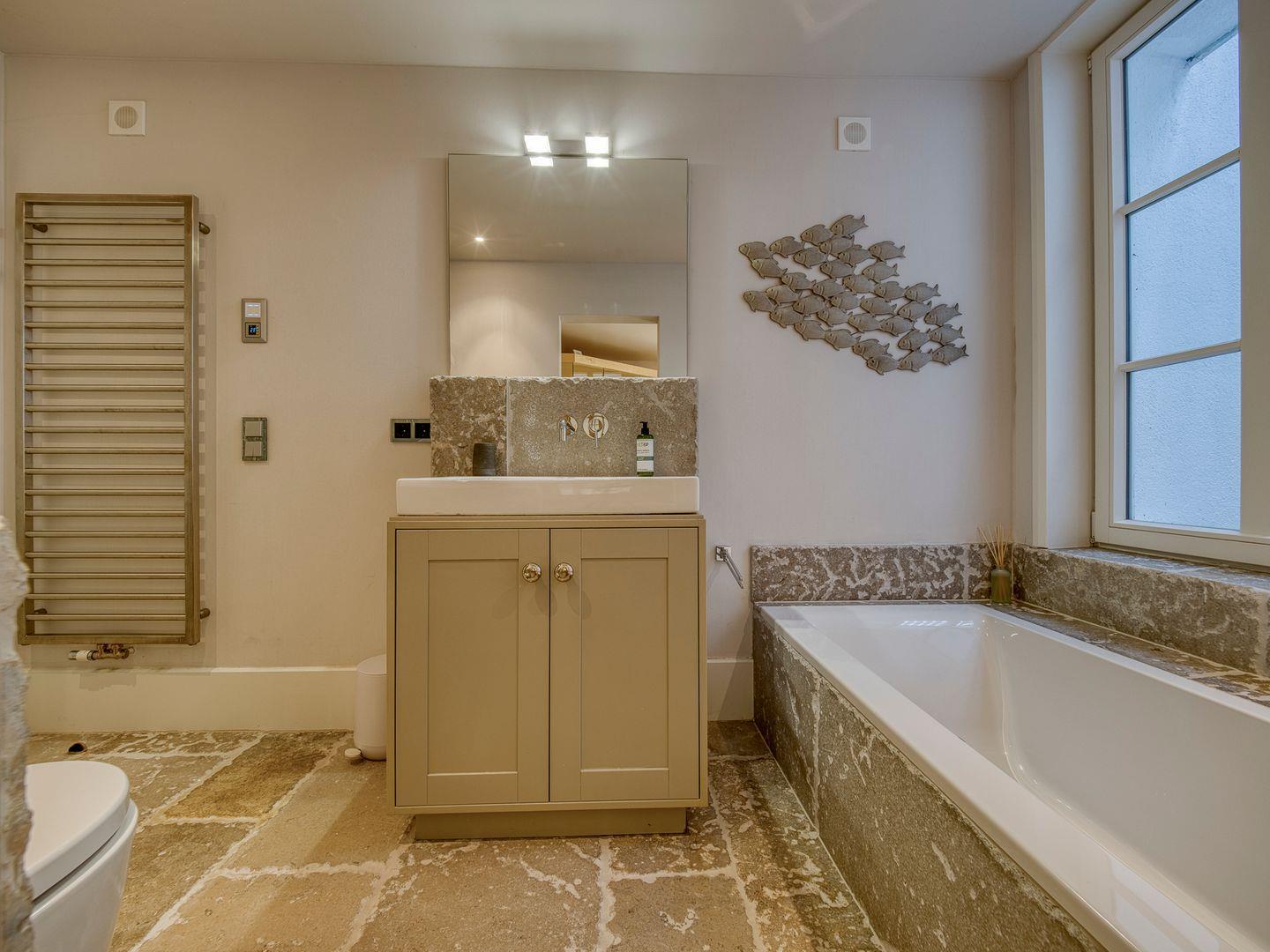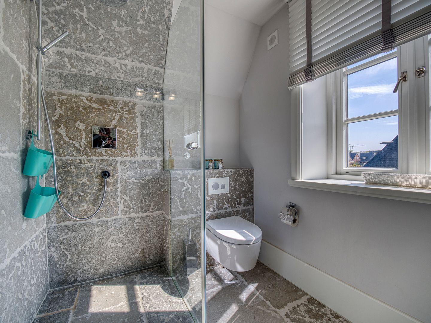 Drei helle und bodengleiche Duschbäder mit Regenduschkopf, Handtuchtrockner und Fenster. Eines der Badezimmer ist zusätzlich mit einer Badewanne ausgestattet und grenzt an die Sauna und einen kleinen Ruhebereich.