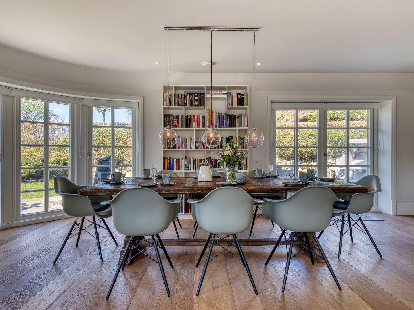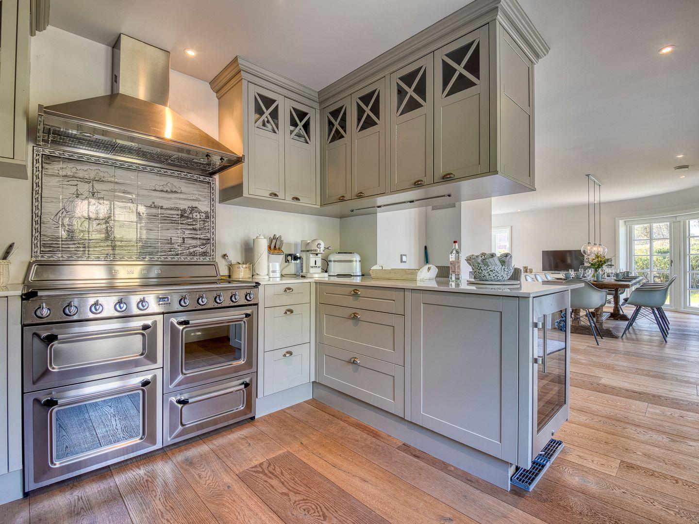 Über einen geräumigen Hausflur mit Garderobe und Ablagefläche gelangen Sie in den hellen und modernen Küchen- und Wohnbereich. Die hellgraue und hochwertige, top ausgestattete, offene Landhausküche lässt für Hobbyköche keine Wünsche offen. 5-Platten-Herd, Backofen, Side-by-Side Kühl- und Gefrierschrank, Weinkühlschrank und Bartresen sind nur ein paar Besonderheiten der Ausstattung. Ein langer Esstisch aus Massivholz ist das Herzstück des Wohnraumes und ermöglicht gesellige Abende mit Familie und Freunden. Die bequeme Sofaecke mit großem TV, Kamin und Blick in den Garten lädt zum Verweilen ein.