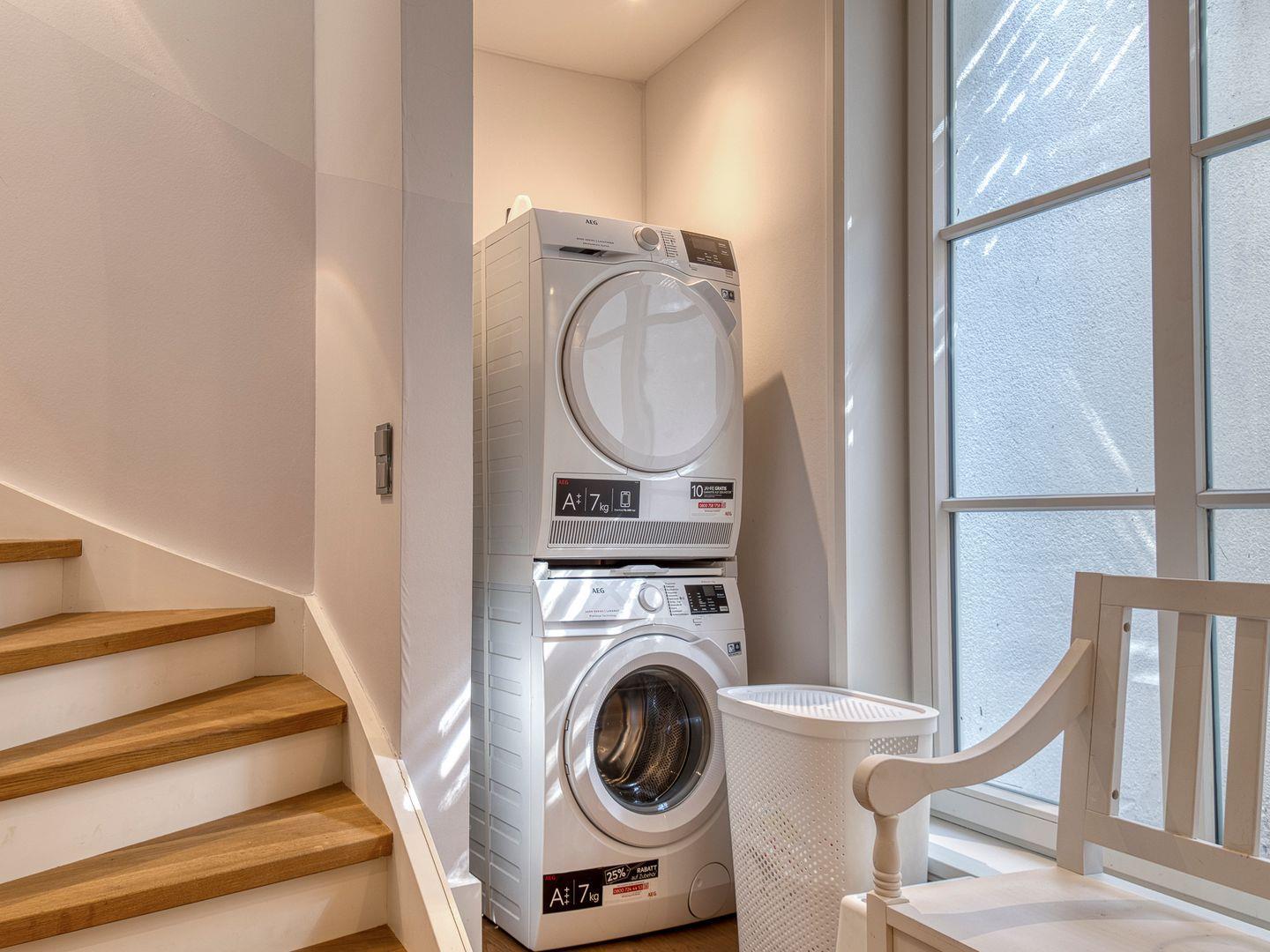 Vom Wohnbereich haben Sie Zugang zur sonnigen und ruhigen Süd-West-Terrasse mit Gartenmöbeln, Strandkorb, Sonnenschirm und Liegen. Der grüne Garten wird von einem bepflanzen Friesenwall umrandet und bietet Privatsphäre. Vor dem Haus besteht die Möglichkeit Fahrräder anzuschließen.
