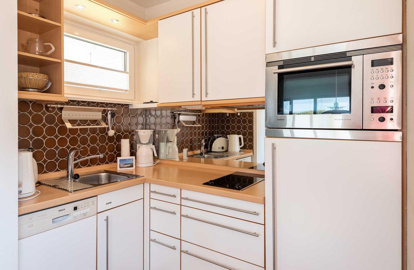 Die gut ausgestattete Küche mit 2-Plattenherd grenzt direkt an den einladenden Essbereich, der Platz für vier Personen bietet und die gemütliche Sofaecke mit Leselampe und TV.