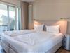 Schlafzimmer 1: Doppel-Schlafzimmer mit hochwertigem Boxspring-Bett (180 x 200 cm), Einbauschrank, bodentiefen Fenstern und separatem Zugang zur Terrasse.
