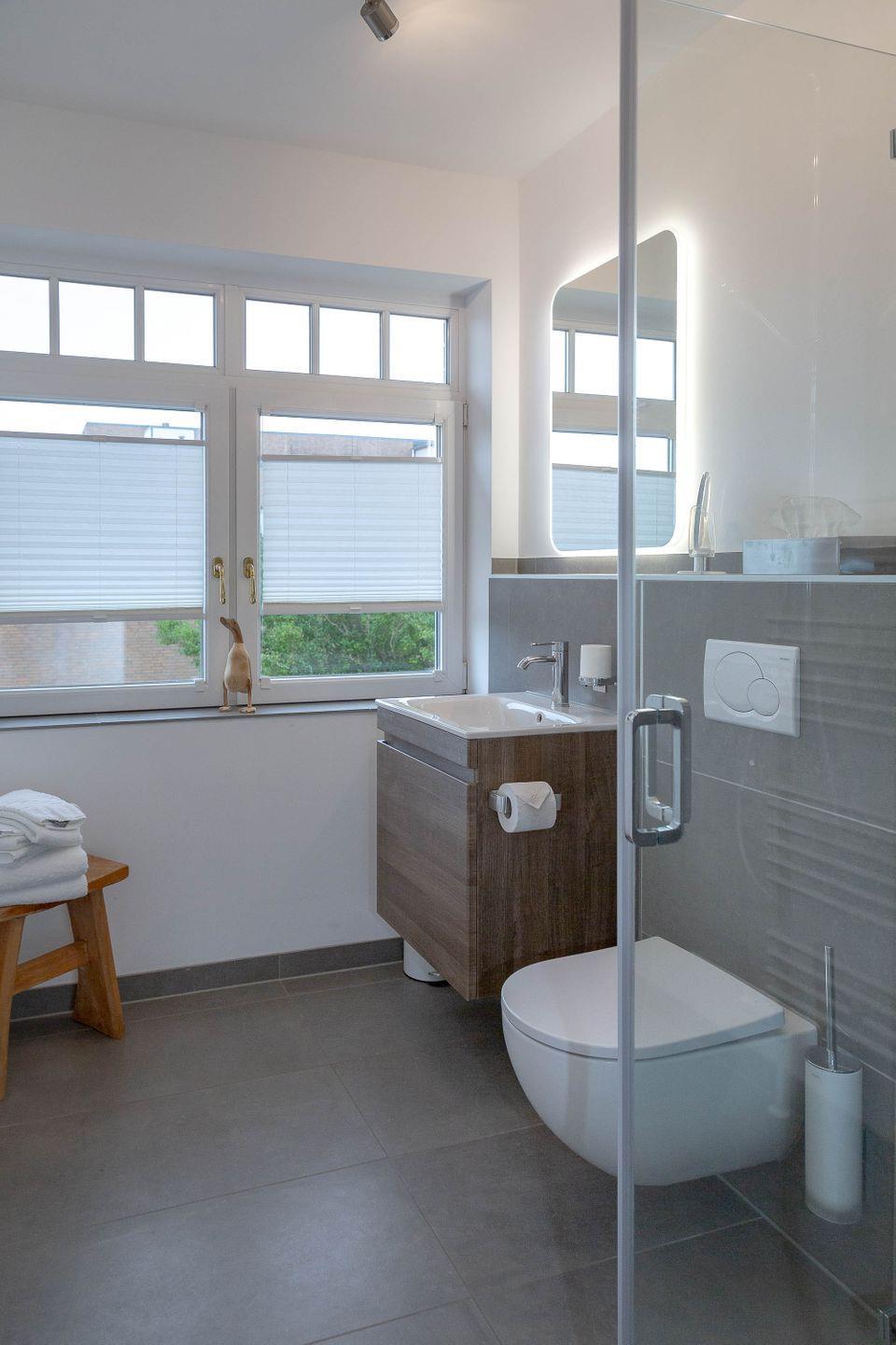 Das Badezimmer ist von Tageslicht durchströmt sind und empfängt Sie komfortabel mit einer ebenerdigen Dusche. Im Keller dieses Hauses befinden sich Waschmaschine und Trockner, welche sie kostenfrei nutzen können.