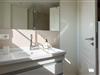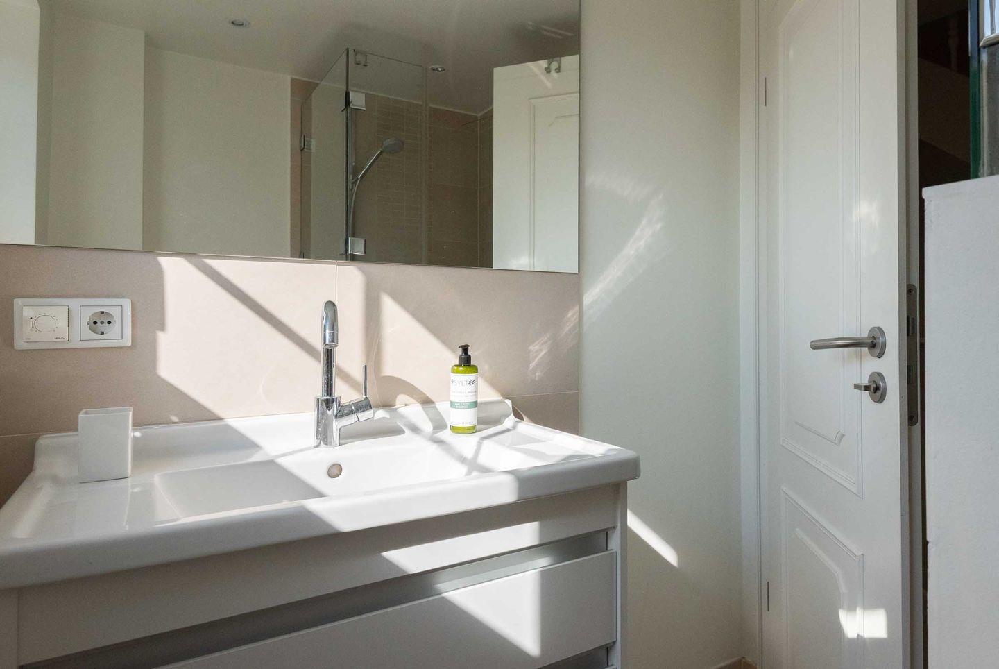 Badezimmer: Kleines und helles Bad mit bodentiefer Dusche, Waschbecken, Handtuchtrockner und Fenster.