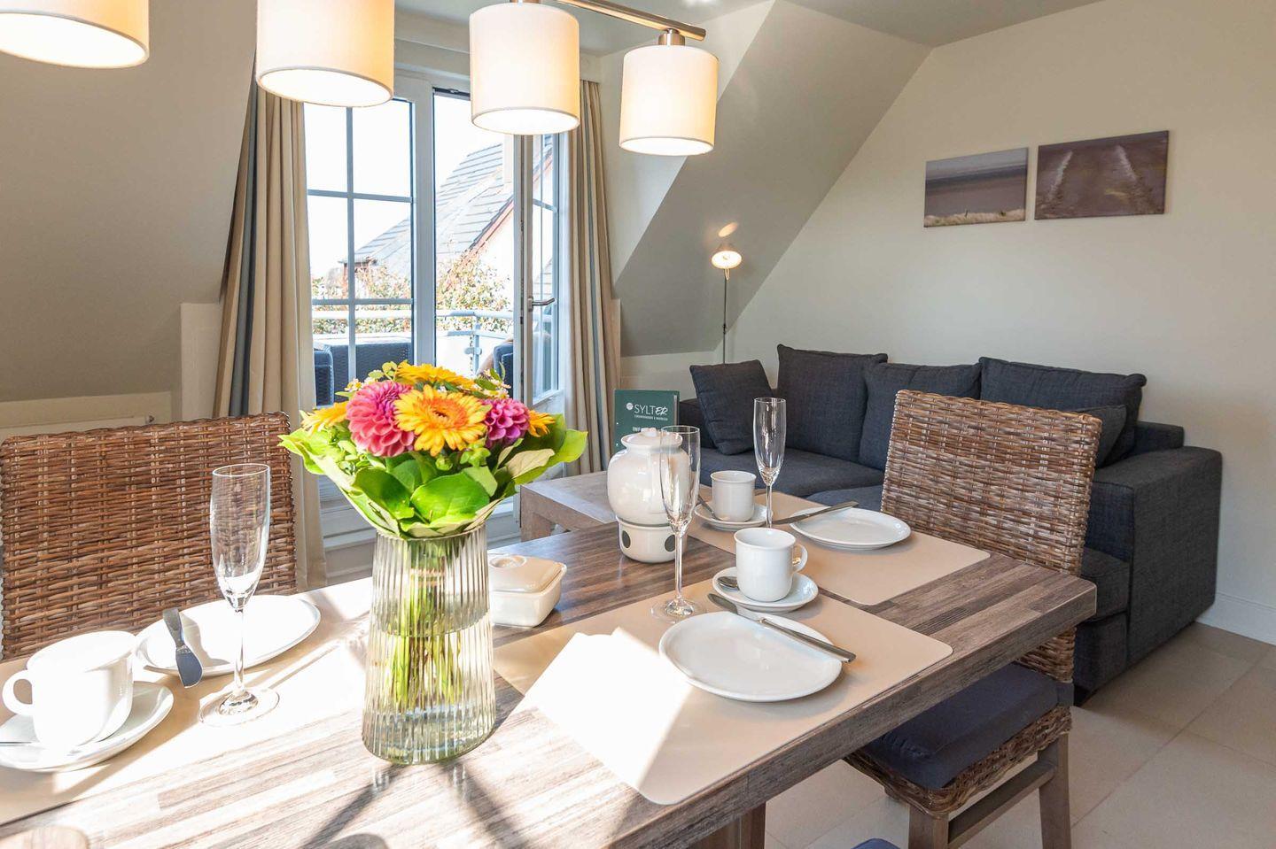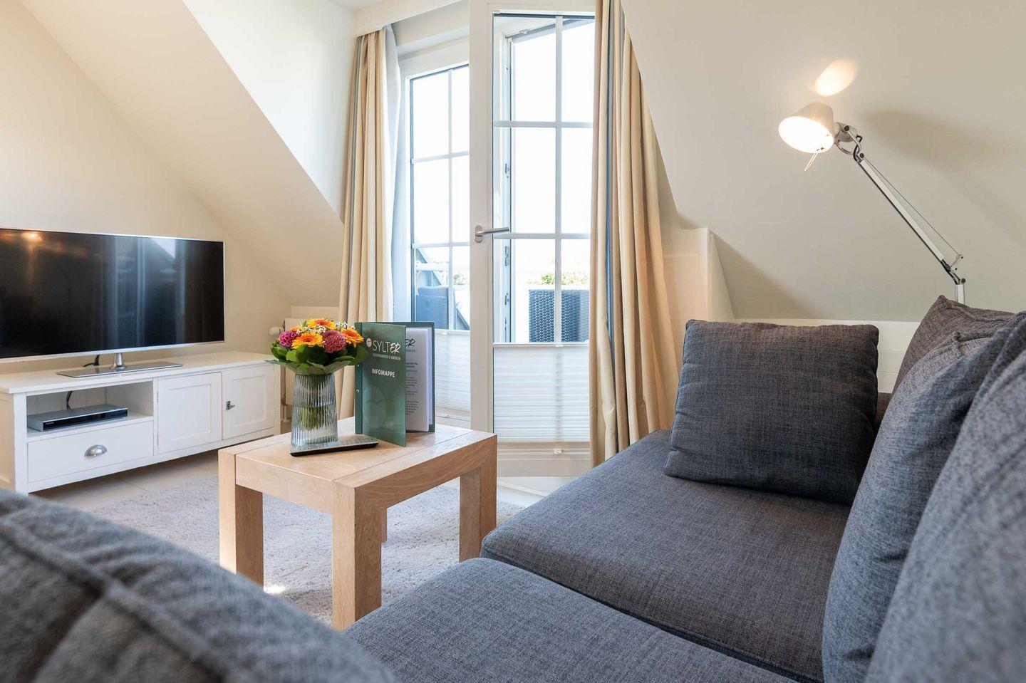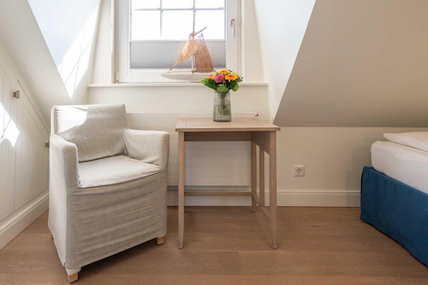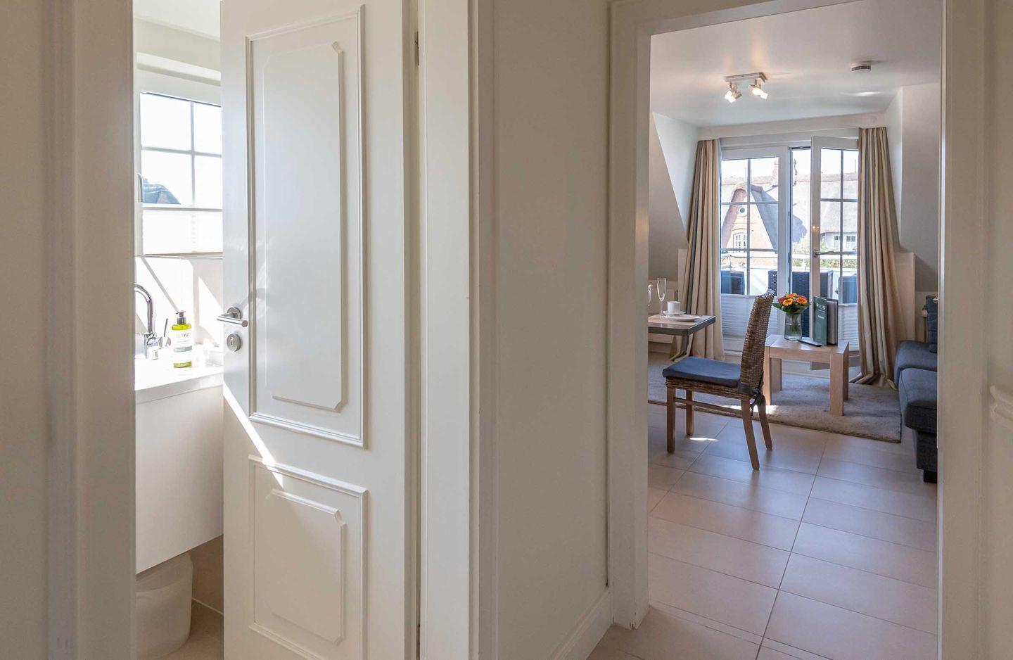 Von hier gelangen Sie auf den kleinen und möblierten West-Balkon, von dem Sie freien Blick auf den grünen Garten und die umliegenden Reetdachhäuser haben.
