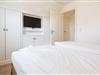 Schlafzimmer 1: Einzelbett (100 x 200 cm), TV, Einbauschrank und kleinem Schreibbereich, der auch das mobile Arbeiten aus dem Urlaub ermöglicht.