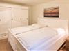 Schlafzimmer 3: Doppelbett, Kleiderschrank, TV und Fenster.