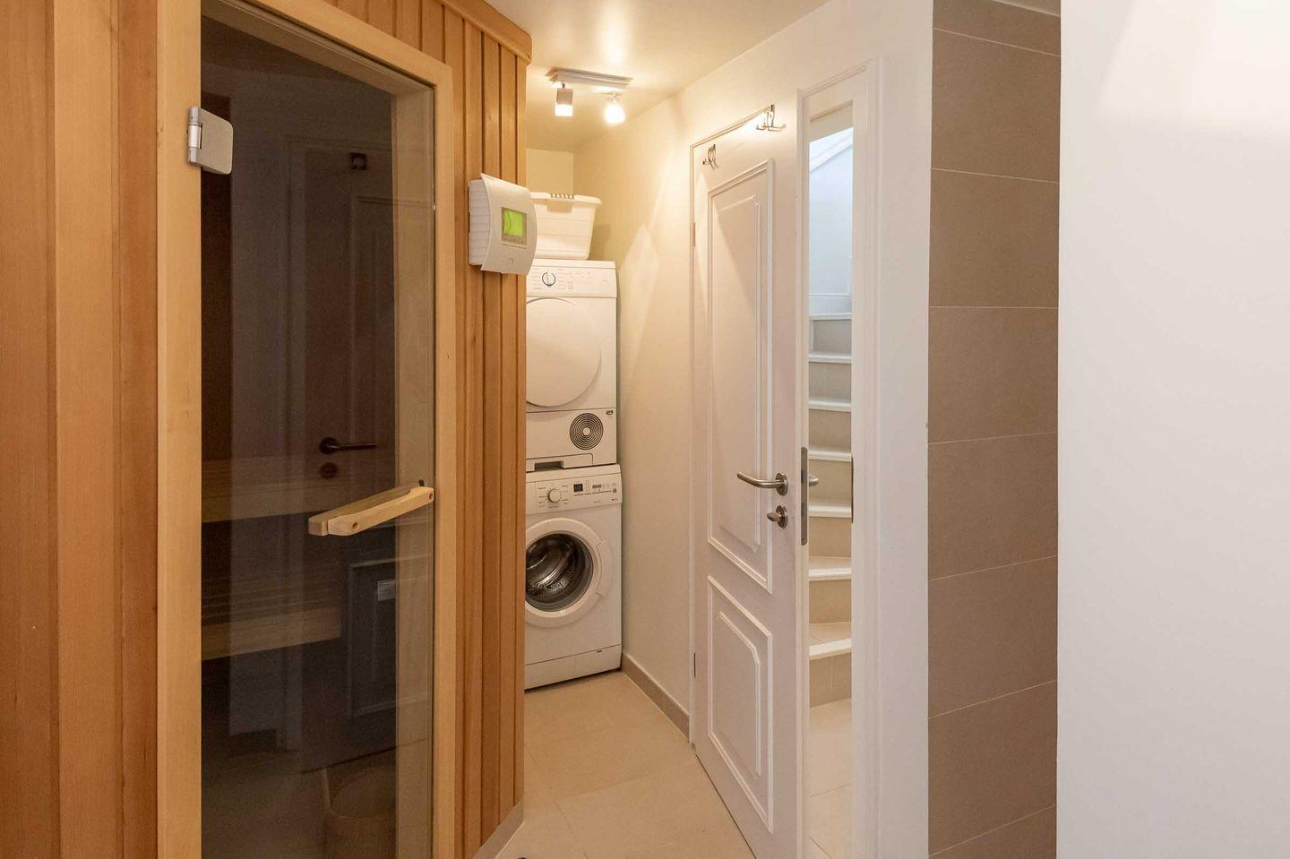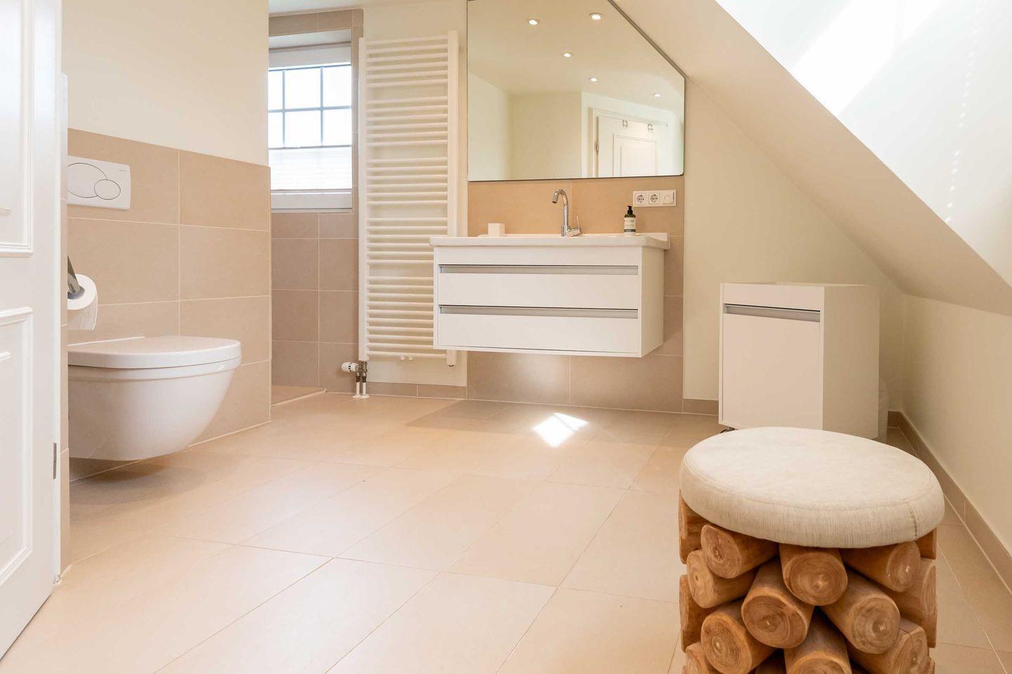 Badezimmer 2: Helles und modernes Bad mit Fußbodenheizung, bodentiefer Dusche, Handtuchtrockner, Fenster und kleiner Sauna.