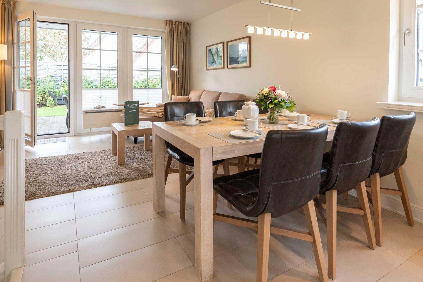 Über eine Terrassentür gelangen Sie vom Wohnzimmer aus auf die sonnige und möblierte West-Terrasse mit Ganzjahresstrandkorb.