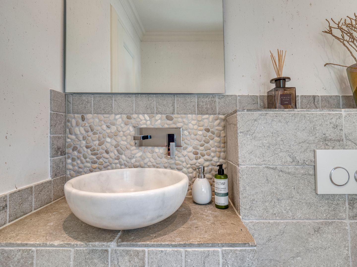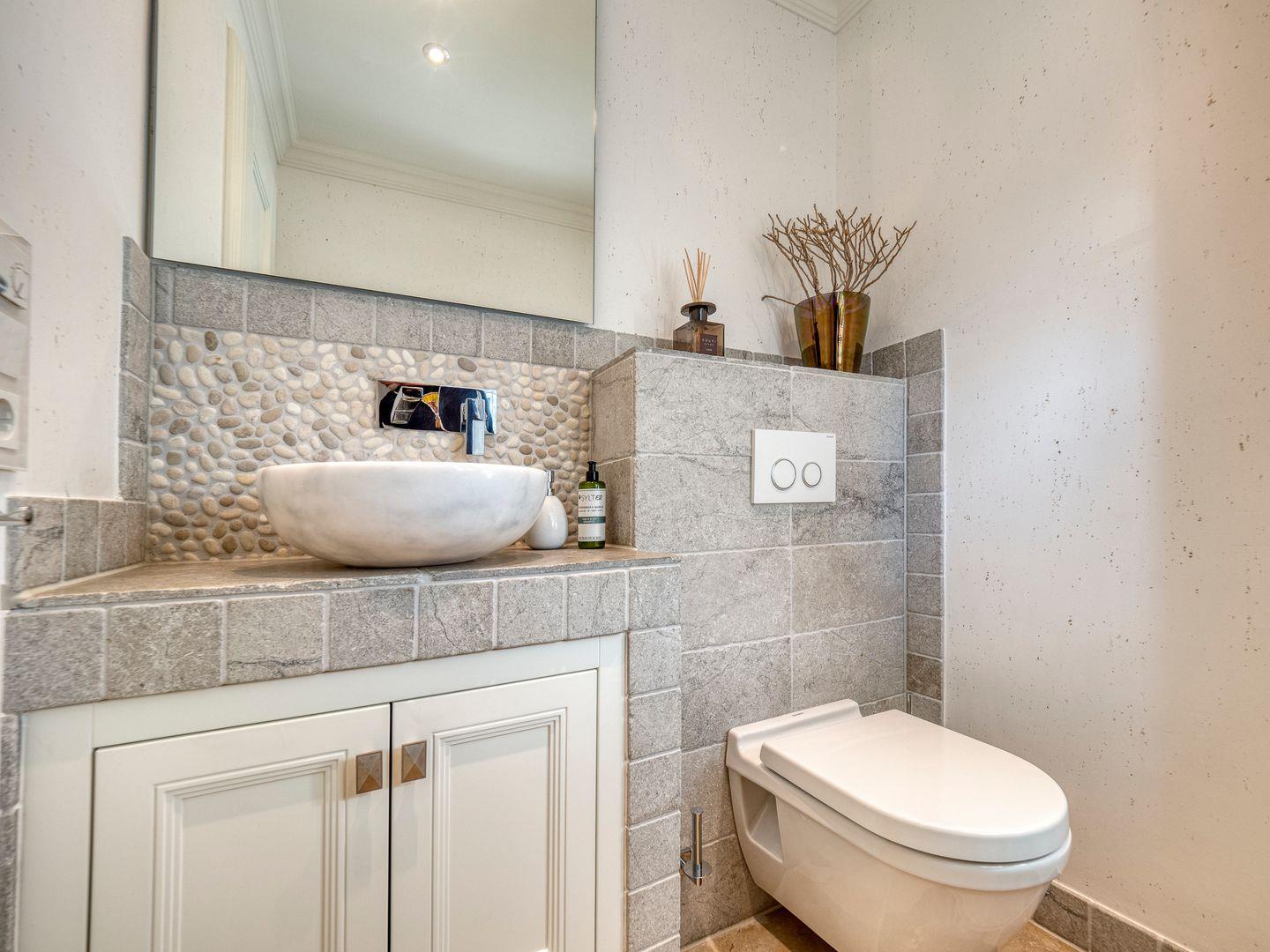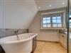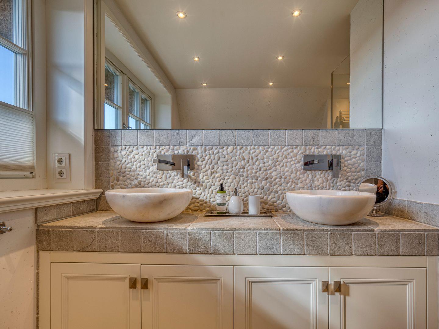 Badezimmer 1: Dusche, freistehende Badewanne, Doppelwaschbecken sowie Fenster. Separates WC.