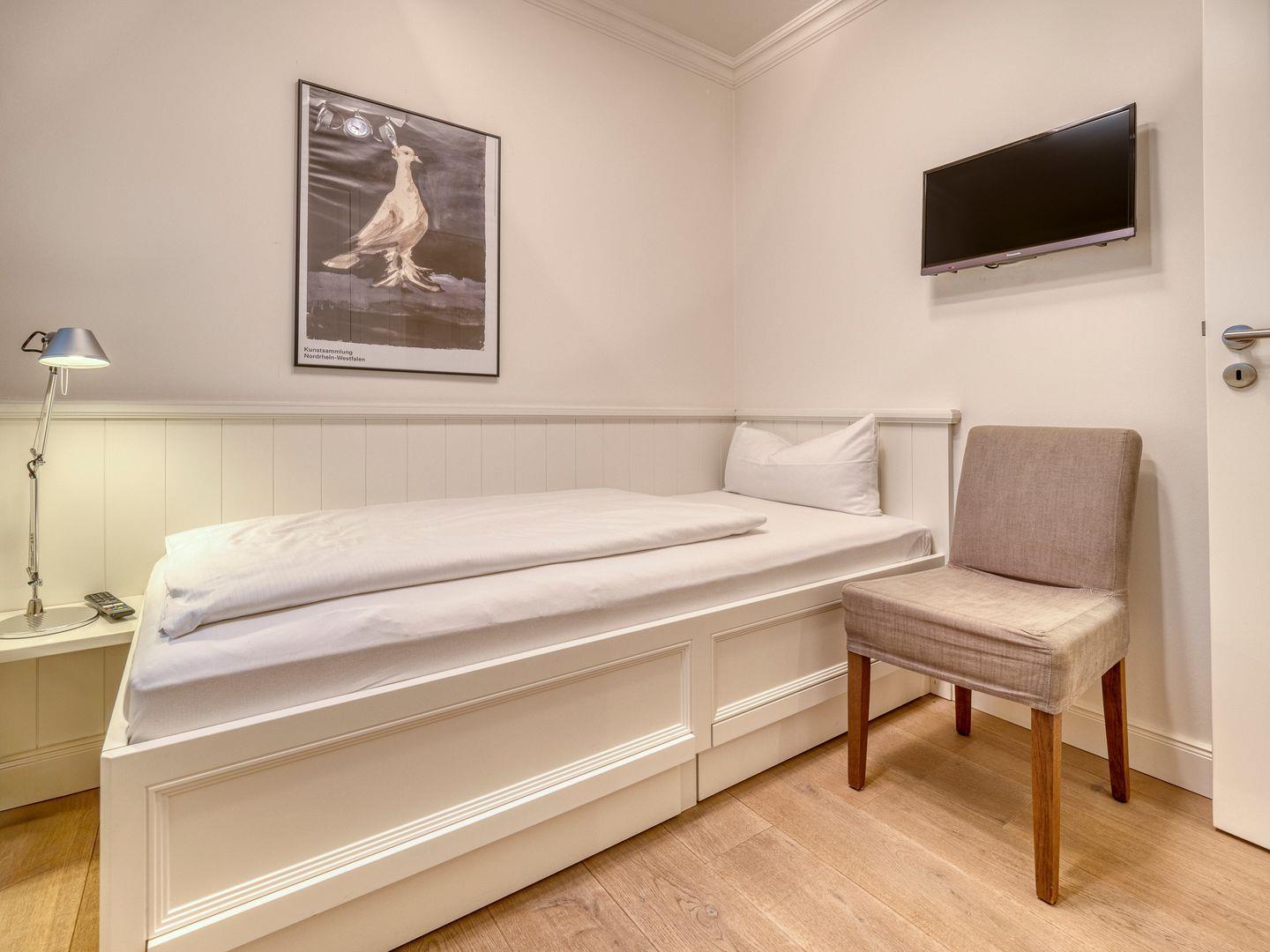 Schlafzimmer 3: Einzelbett (1,0 x 2,0 m), TV und Fenster.