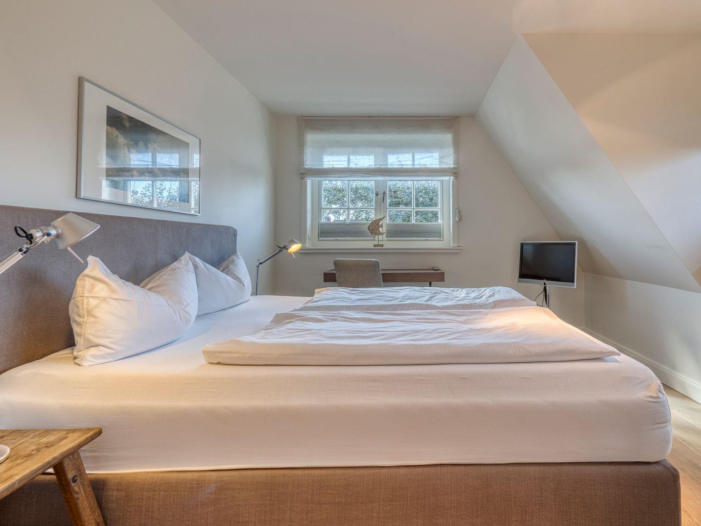 Schlafzimmer 1: Boxspringbett, Einbauschränke, TV und Fenster. Ein kleiner Schreibbereich ermöglicht mobiles Arbeiten im Urlaub.