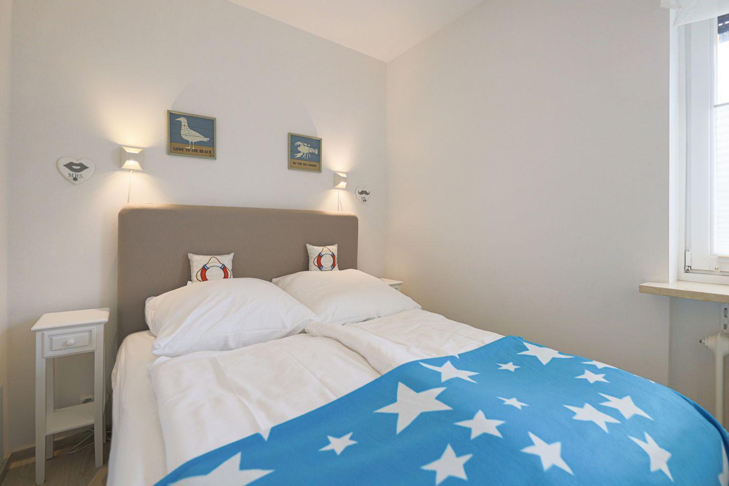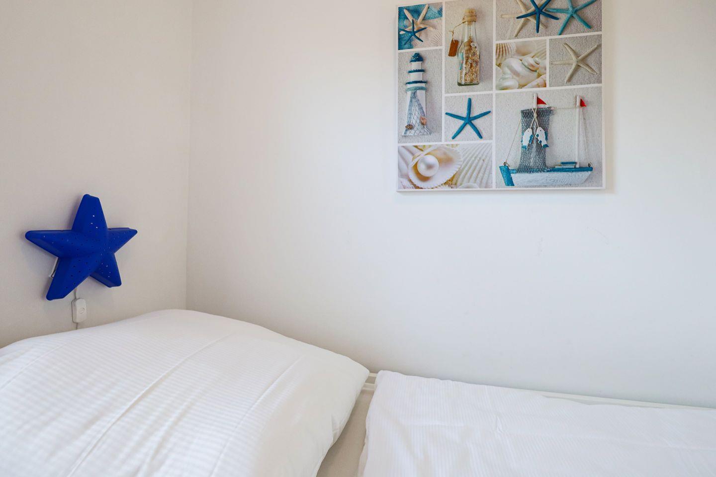 Die Wohnung verfügt über zwei separate Schlafräume im Erdgeschoss. Eines ist mit einem Doppelbett (140x200, durchgehende Matratze) versehen, das zweite verfügt über ein Einzelbett.