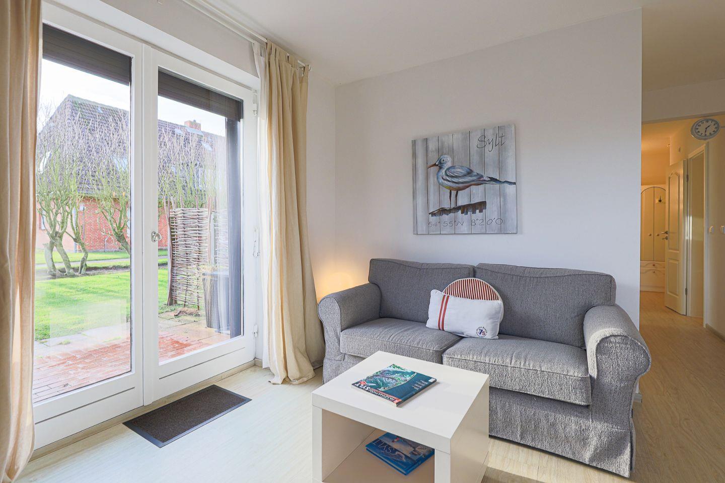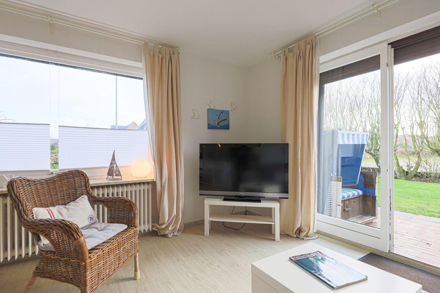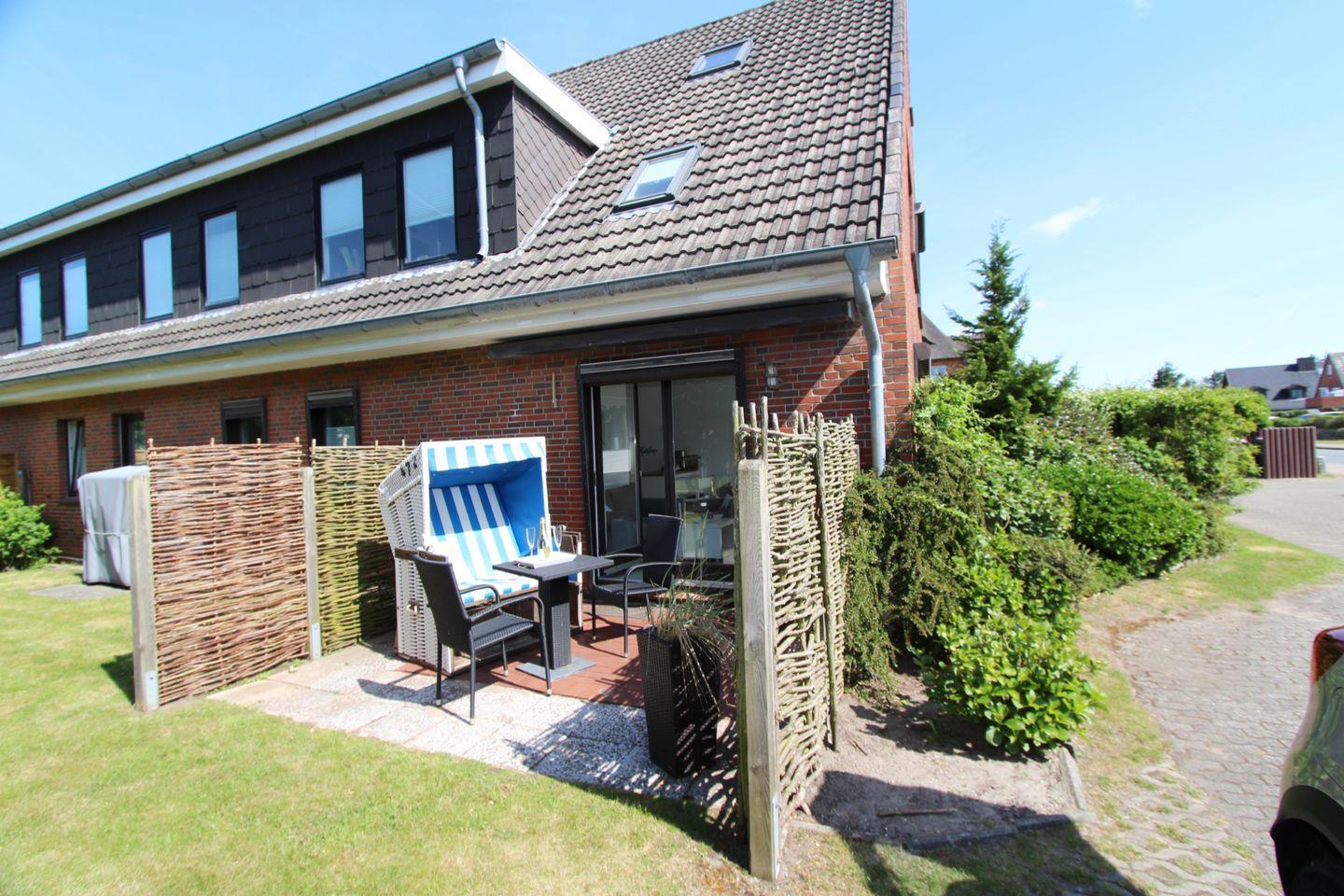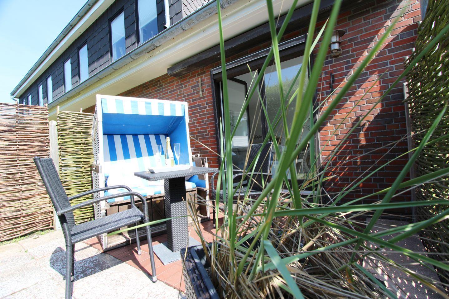 Vom Wohnbereich aus geht es auf die Süd-Terrasse mit komfortablen Gartenmöbeln. Der Strandkorb zum Verweilen ein.