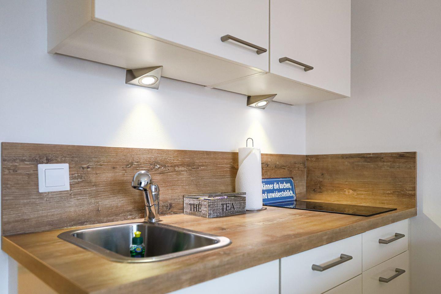 In der voll ausgestatteten Küchenzeile können Sie nach Herzenslust kochen. Der Essensplatz im Wohnbereich lädt zu entspannten Mahlzeiten ein.