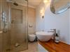 Badezimmer 1: Bodentiefe Dusche, WC, Waschbecken und Fenster.