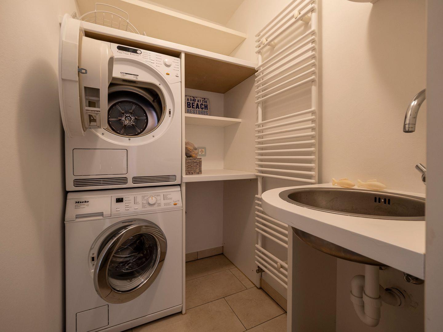 Hauswirtschaftsraum: Waschmaschine und Trockner zur Eigennutzung sowie viel Abstell- und Regalfläche für Gepäck und Vorräte.