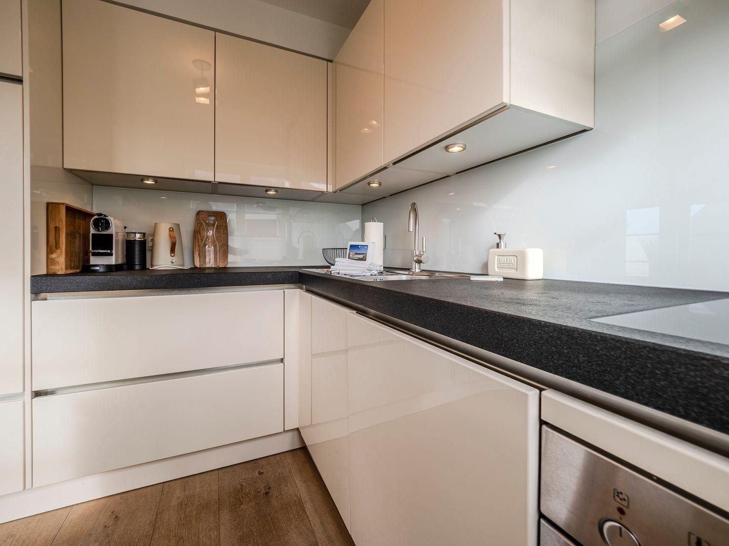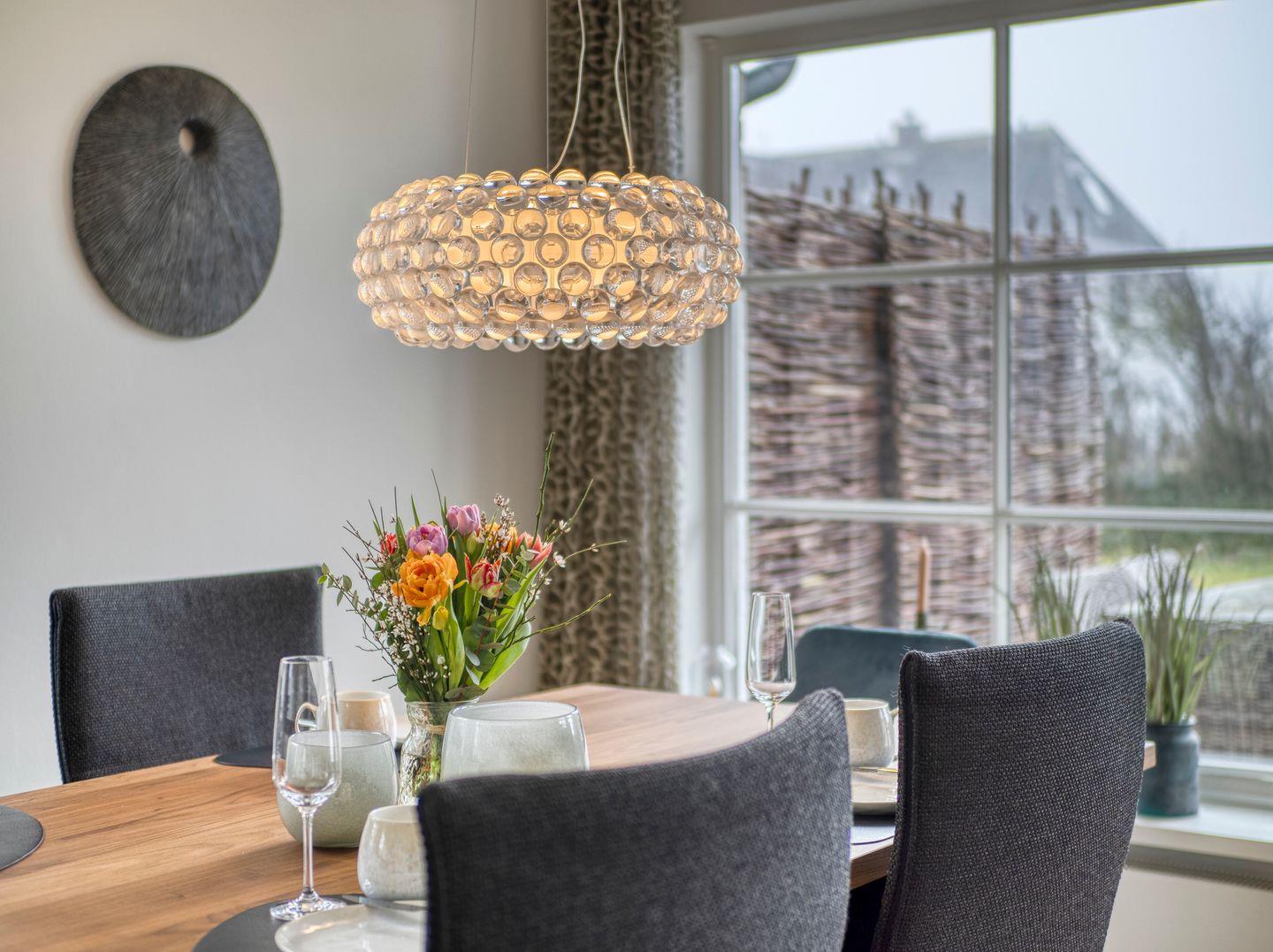 Küche mit Wohn-/Essbereich: Die offene, moderne und sehr hochwertig ausgestattete Küche geht in den Essbereich über, der mit einem großen Esstisch und bequemen Esstischstühlen zum gemütlichen Beisammensein einlädt. Vom großen Sofa mit TV blicken Sie in den großzügigen und grünen Garten.
