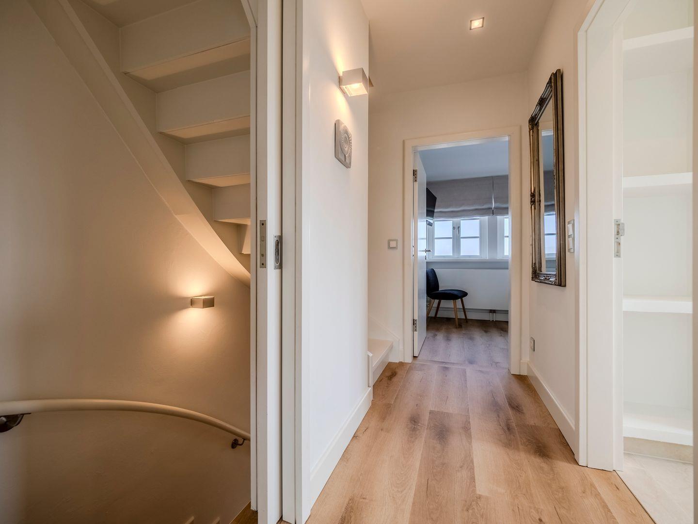 Vom Flur führt eine Treppe in das helle und exklusiv eingerichtete Obergeschoss. Am oberen Treppenabsatz können Sie eine Schiebetür zuziehen.