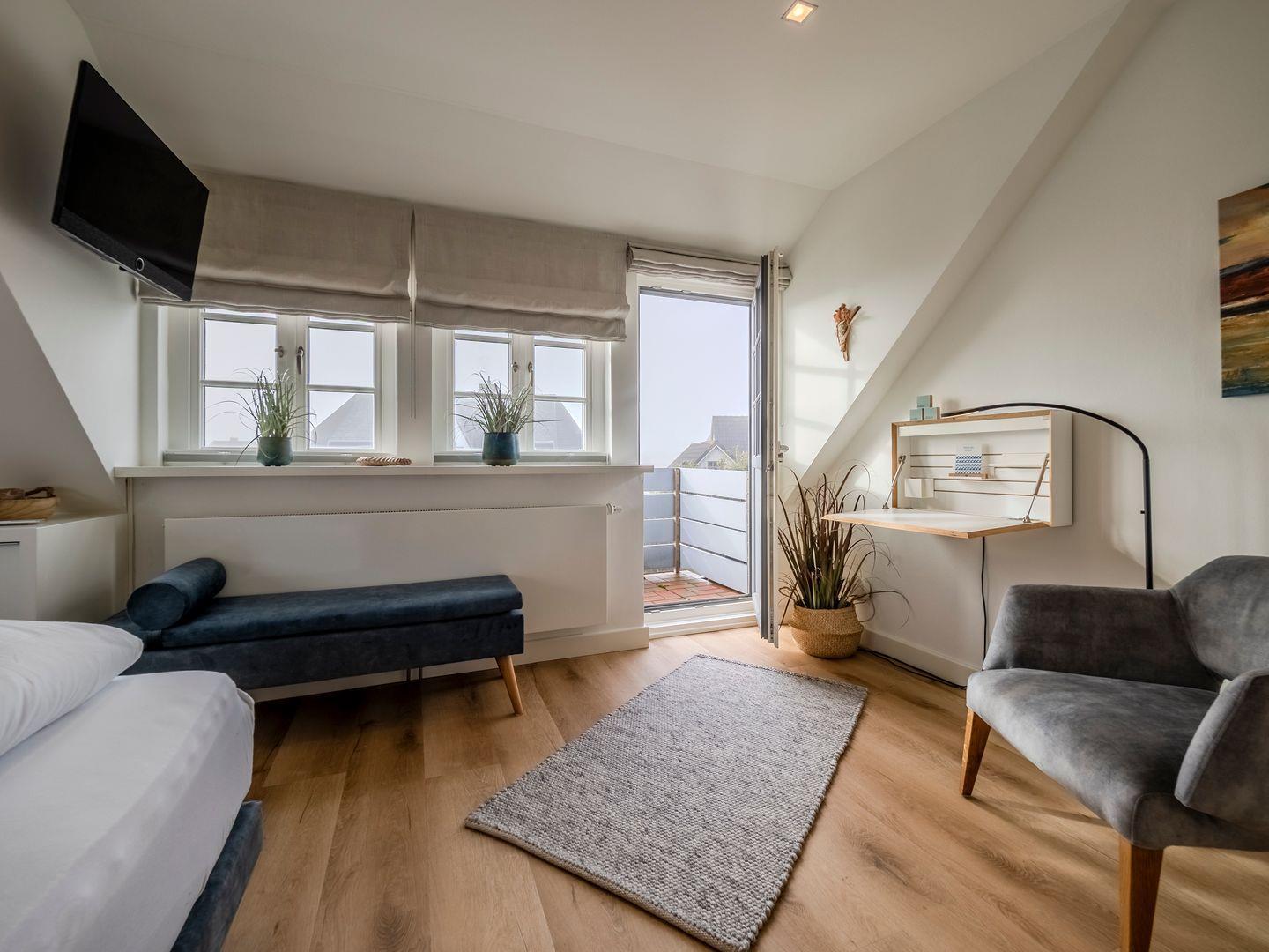 Schlafzimmer 2: Großes eingebautes Doppelbett mit Überlänge (1,80 x 2,10 m), begehbarer Kleiderschrank, TV und Blick auf die Dünen.