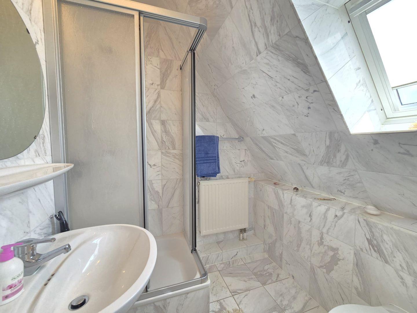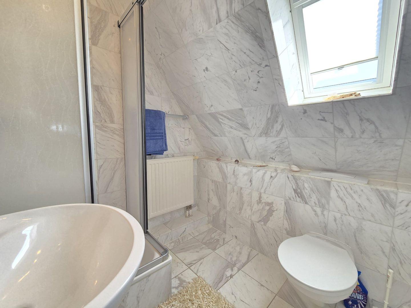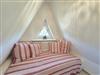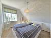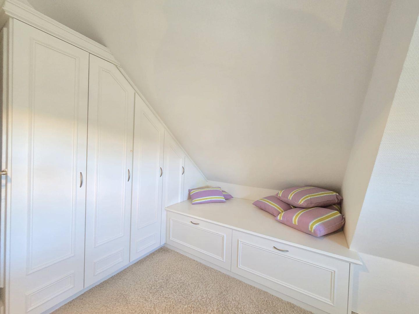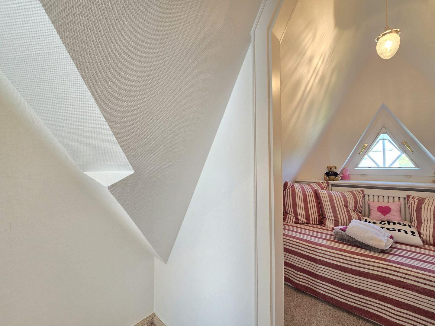 Über eine stilvolle Treppe erreichen Sie das obere Stockwerk, das ebenfalls durchdacht gestaltet ist. Hier befindet sich ein zweites Tageslichtbad, ideal für die Nutzung durch mehrere Gäste. Das große Schlafzimmer ist mit einem hochwertigen Boxspringbett möbliert und bietet einen privaten Rückzugsbereich. Die Ausstattung der Wohnung überzeugt mit modernen, hochwertigen Möbeln im typischen Sylter Stil und sorgt für einen entspannten und komfortablen Aufenthalt.