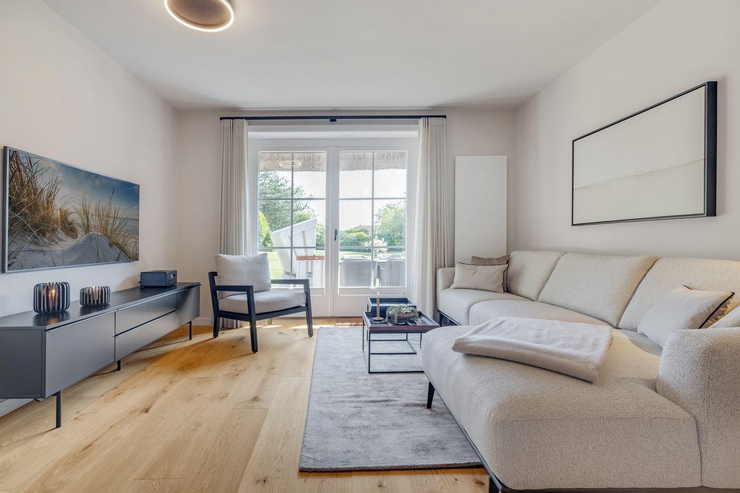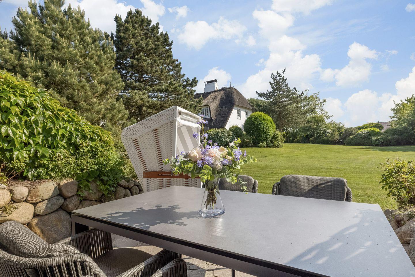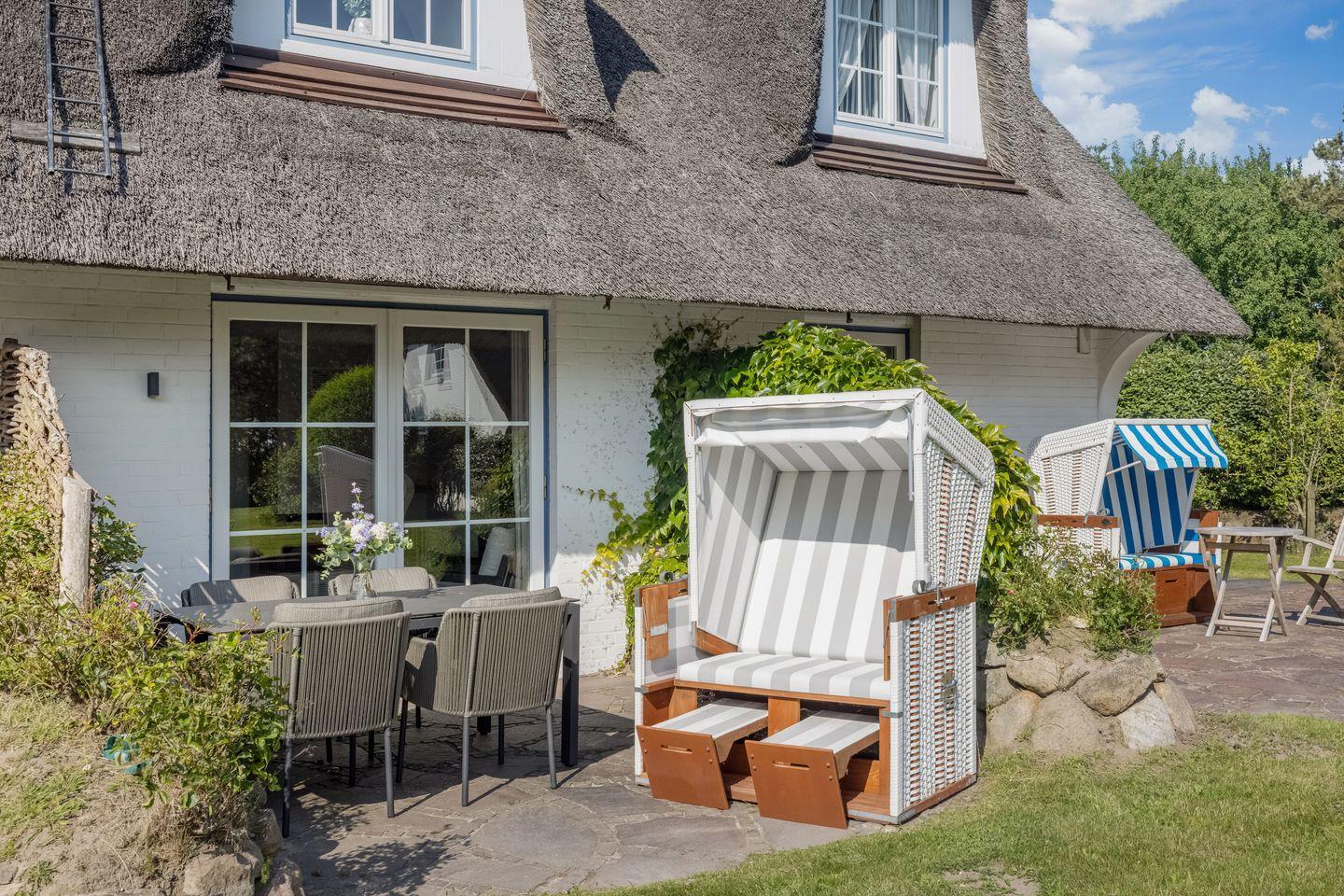 Die großen Fenster sorgen für eine helle und freundliche Atmosphäre und bieten Ihnen den Blick ins Grüne. Ein Sichtschutz für alle Fenster gewährleistet Ihre Privatsphäre, während Sie die frische Luft und den Blick in den Garten genießen können. Die private Terrasse mit Gartenmöbeln und einem Strandkorb lädt zum Entspannen ein und bietet ausreichend Platz für unvergessliche Stunden im Freien.