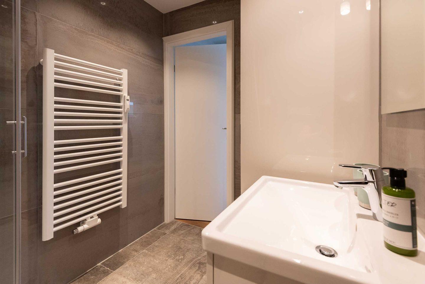 Badezimmer: Modernes Duschbad mit WC und elektrischem Handtuchhalter.