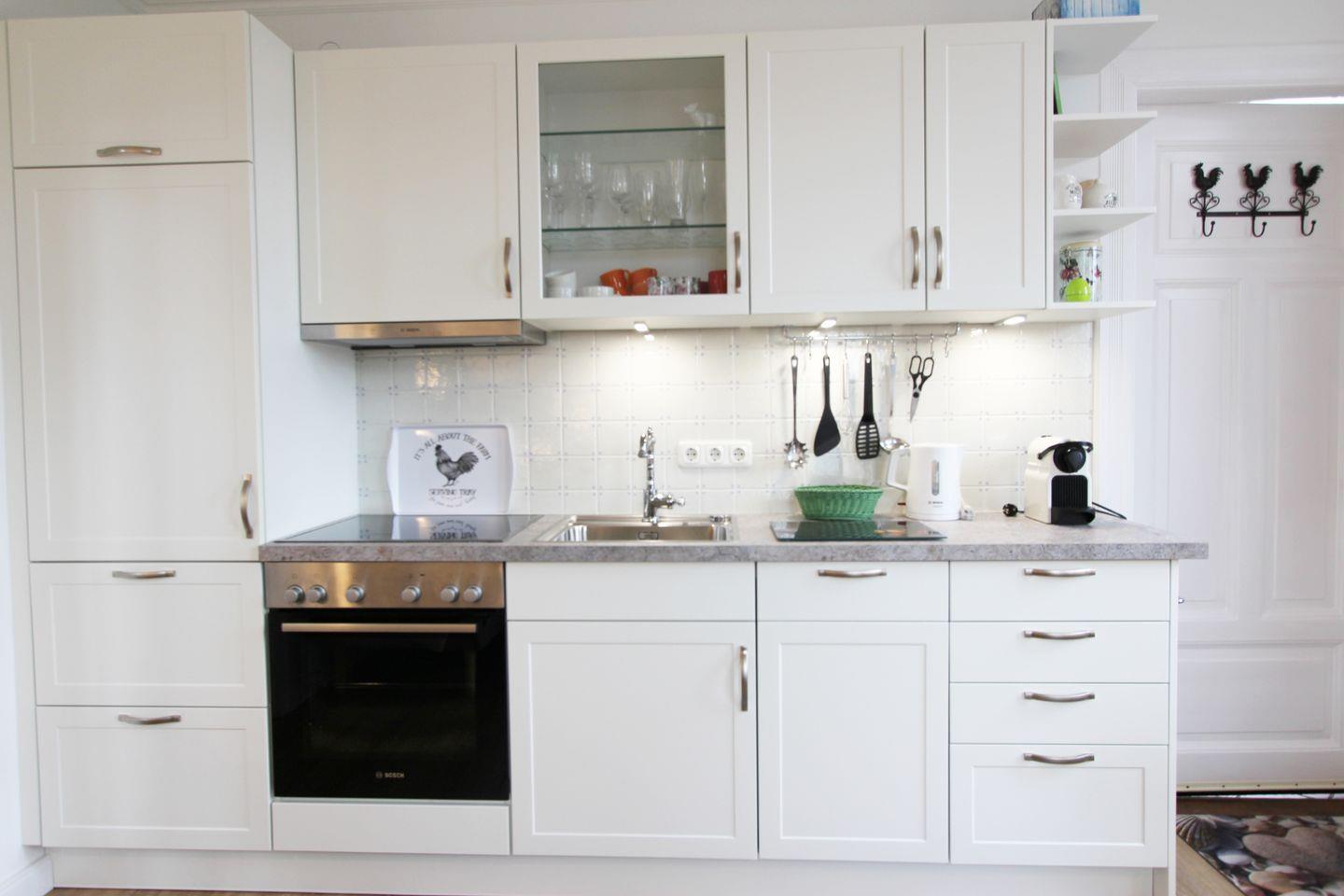 Sehr gut ausgestattete Landhausküche mit Backofen, Spülmaschine und vielen Extras, sowie einem gemütlichen Essplatz. Hier macht Kochen Spaß und wenn Sie mögen, können Sie sogar Waffeln backen.