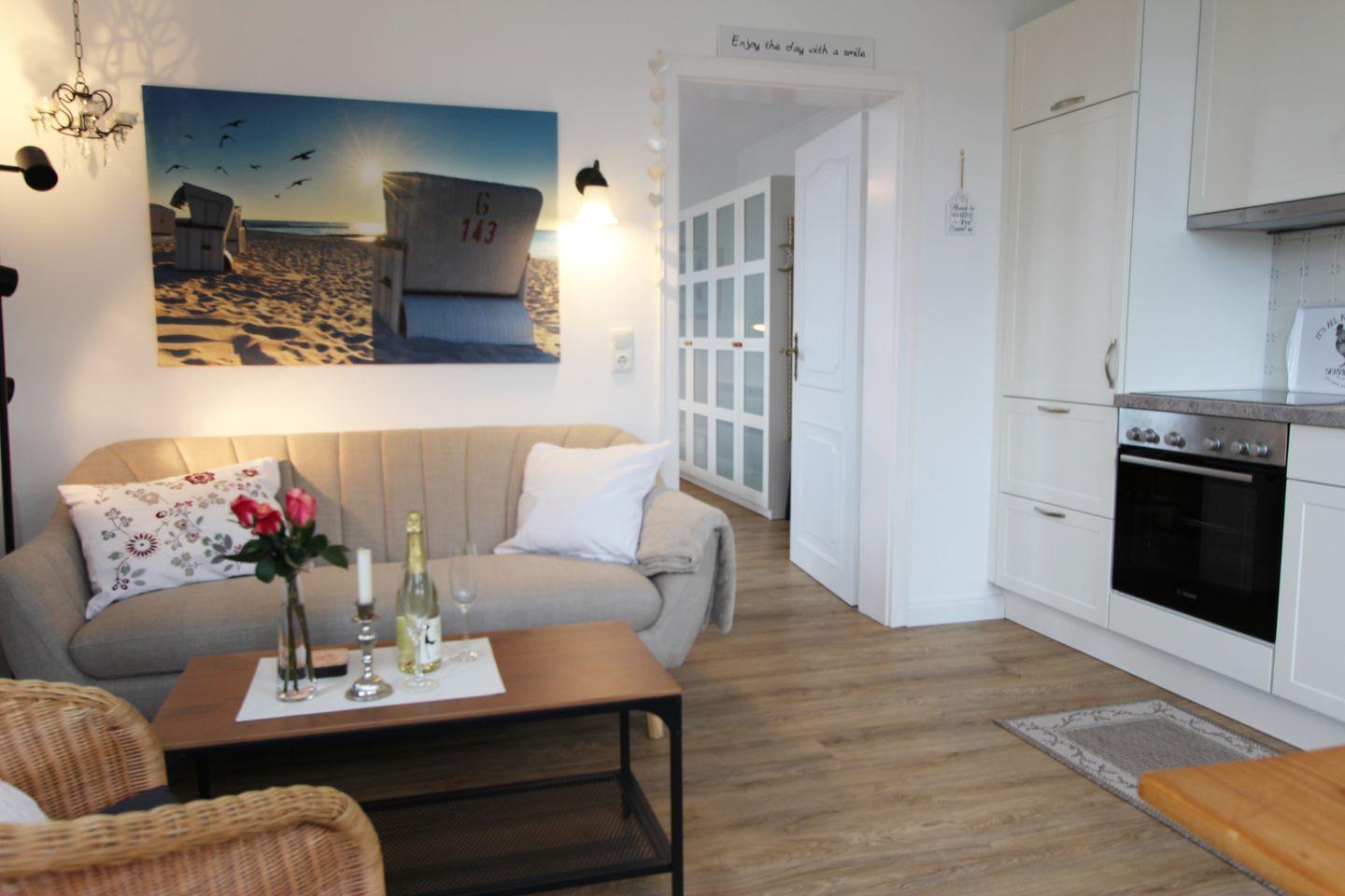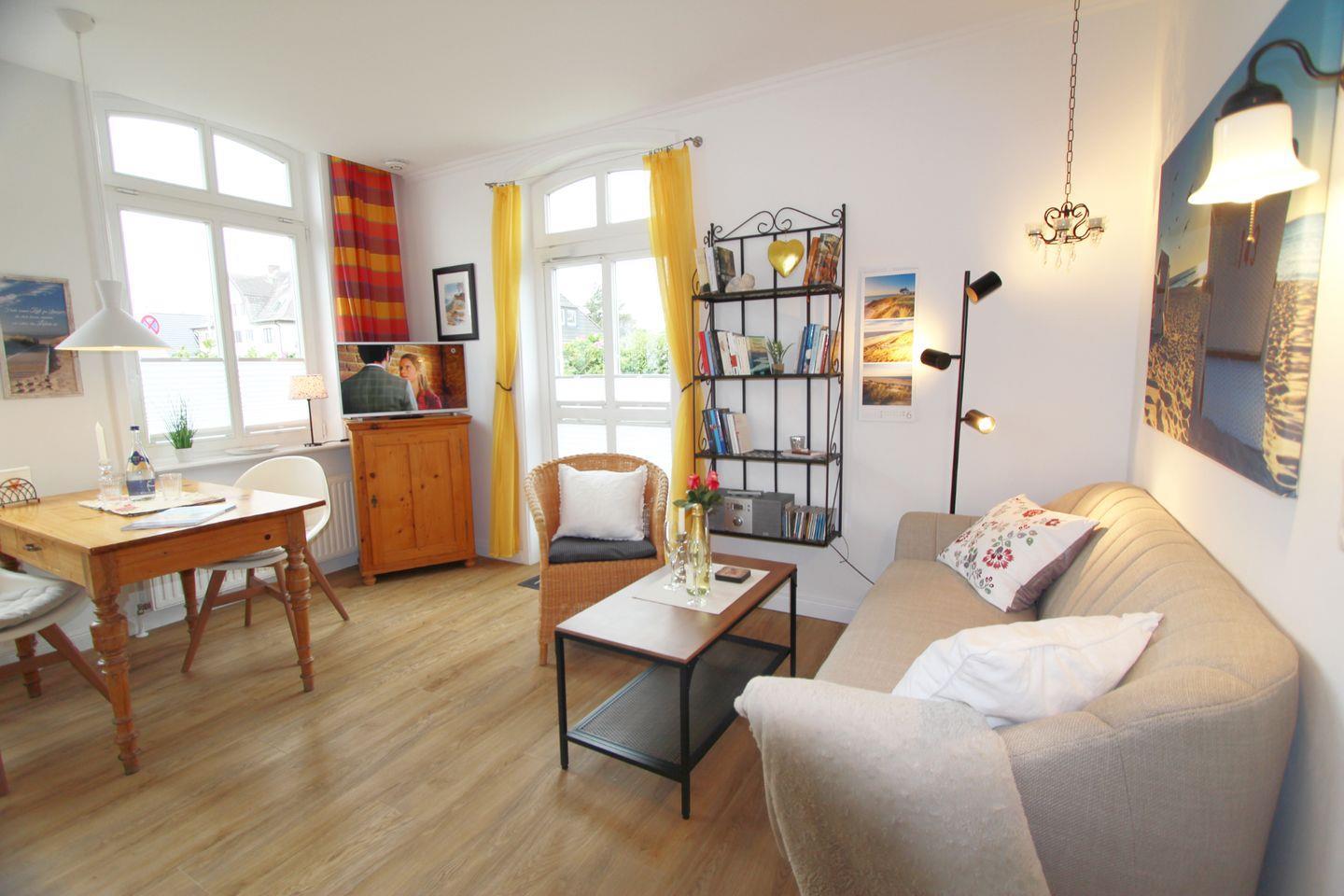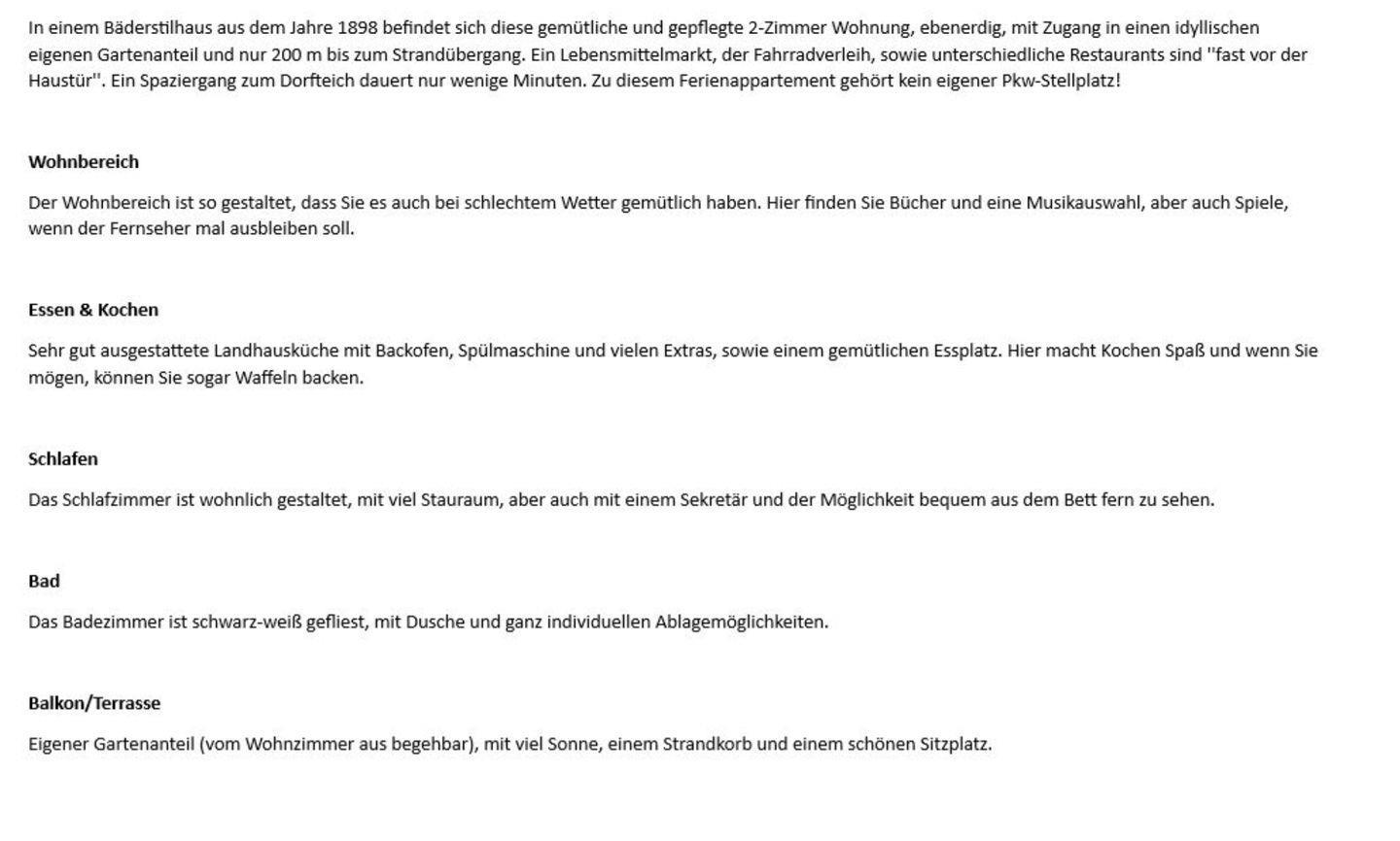 In einem Bäderstilhaus aus dem Jahre 1898 befindet sich diese gemütliche und gepflegte 2-Zimmer Wohnung, ebenerdig, mit Zugang in einen idyllischen eigenen Gartenanteil und nur 200 m bis zum Strandübergang. Ein Lebensmittelmarkt, der Fahrradverleih, sowie unterschiedliche Restaurants sind ''fast vor der Haustür''. Ein Spaziergang zum Dorfteich dauert nur wenige Minuten. Zu diesem Ferienappartement gehört kein eigener Pkw-Stellplatz!