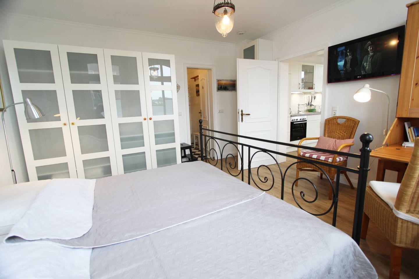 Das Schlafzimmer ist wohnlich gestaltet, mit viel Stauraum, aber auch mit einem Sekretär und der Möglichkeit bequem aus dem Bett fern zu sehen.