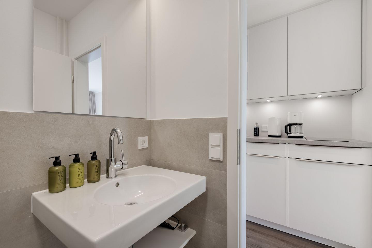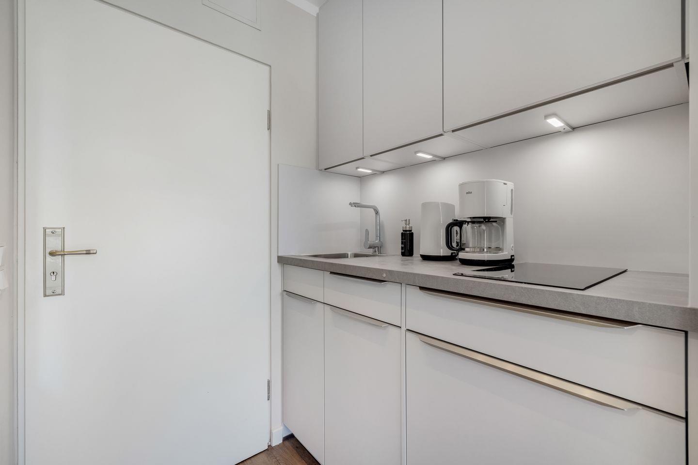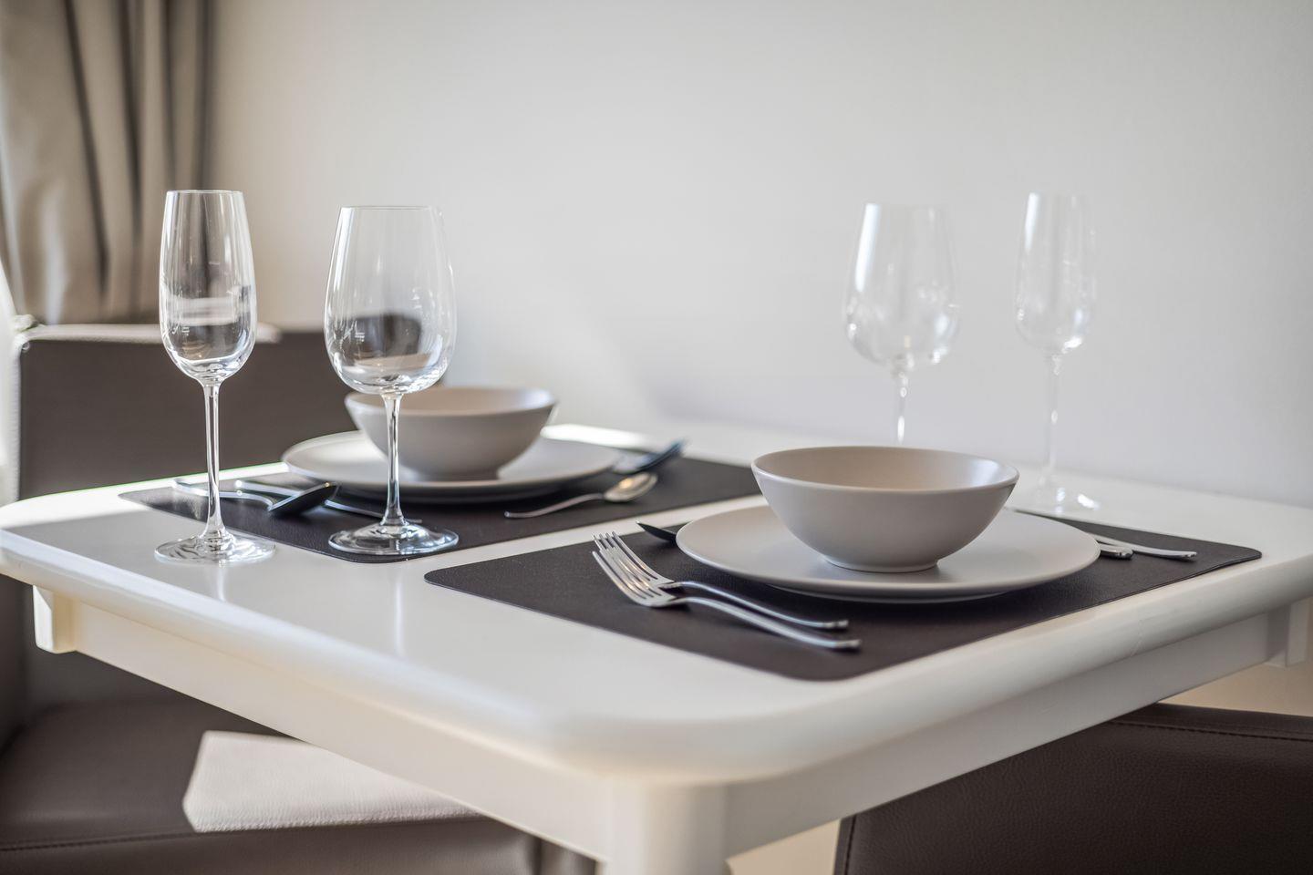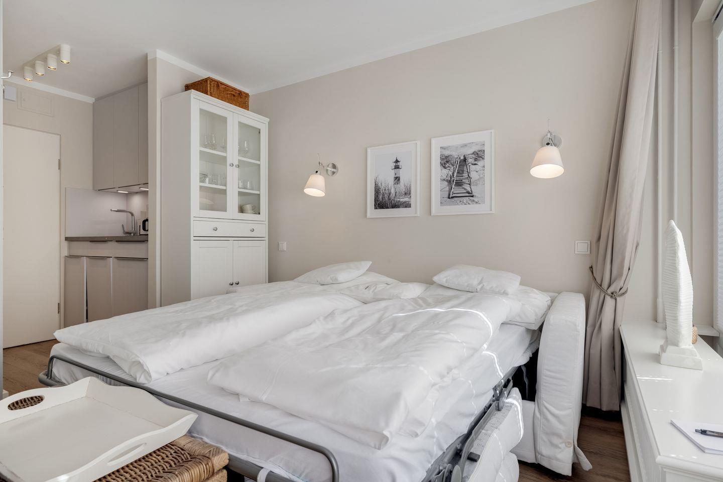 Das offen gestaltete Konzept mit einem kombinierten Wohn- und Schlafbereich schafft eine helle, einladende Atmosphäre. Das komfortable Sofa und der digitale TV sorgen für entspannte Stunden. Die Küche ist offen in den Wohnbereich integriert und ausgestattet mit modernen Geräten wie Spülmaschine, Mikrowelle, Kühlschrank, Nespresso-Espressomaschine, Toaster, Wasserkocher sowie sämtlichem Geschirr und Besteck.