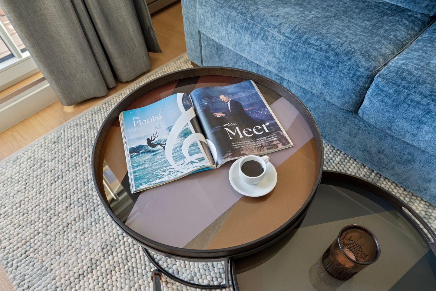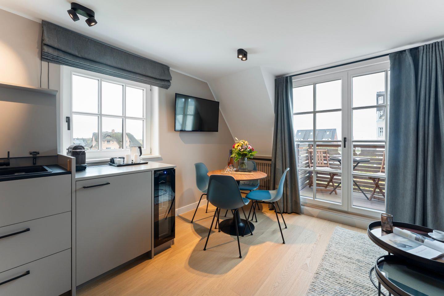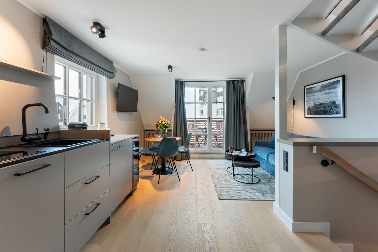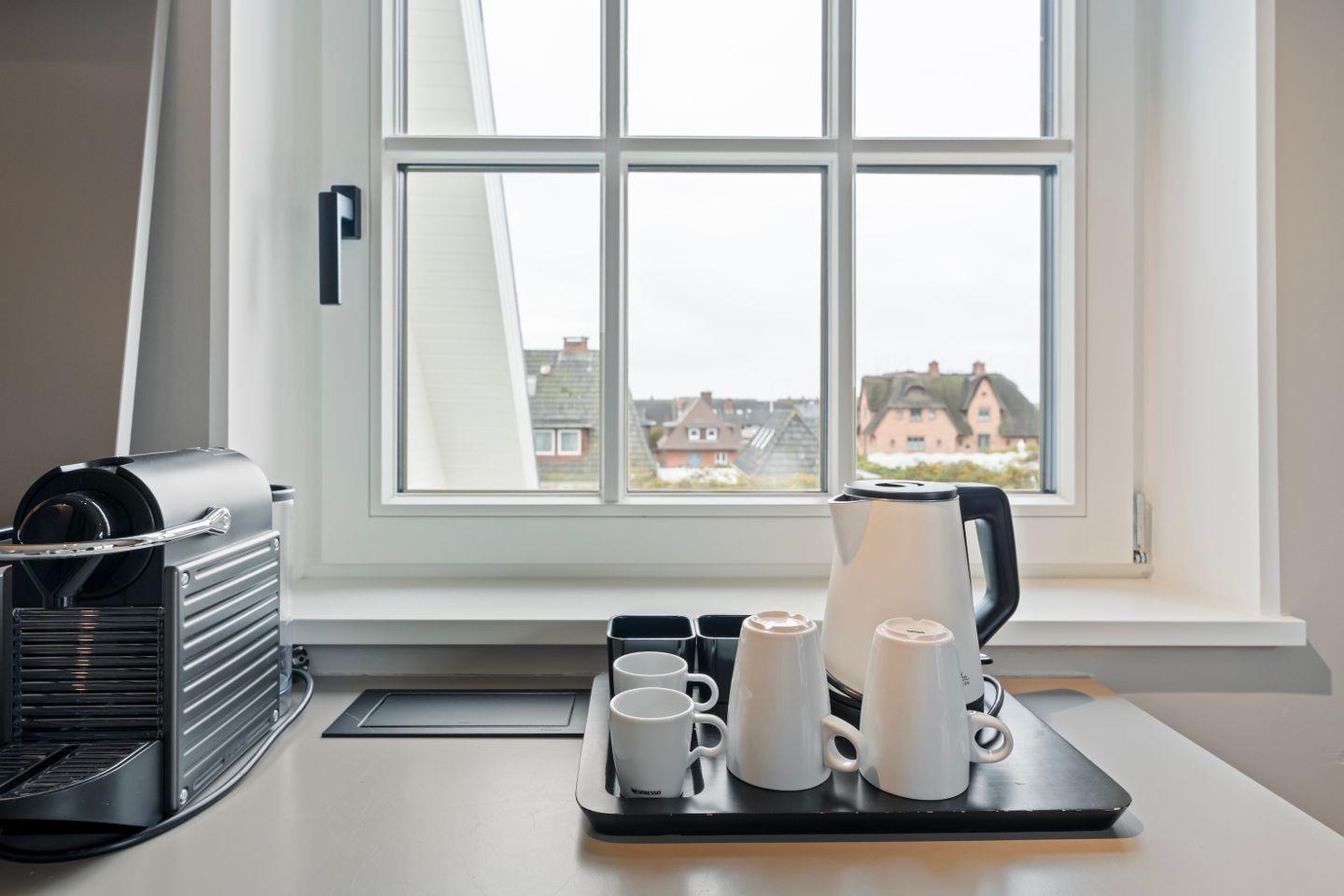 Die offene Pantry-Küche ist perfekt ausgestattet für kleine kulinarische Auszeiten. Ein Induktionskochfeld, Weinkühlschrank, Kühlschrank mit Gefrierfach, Geschirrspüler und eine Nespresso-Maschine stehen bereit – ob für ein schnelles Frühstück oder einen selbst zubereiteten Snack am Abend.