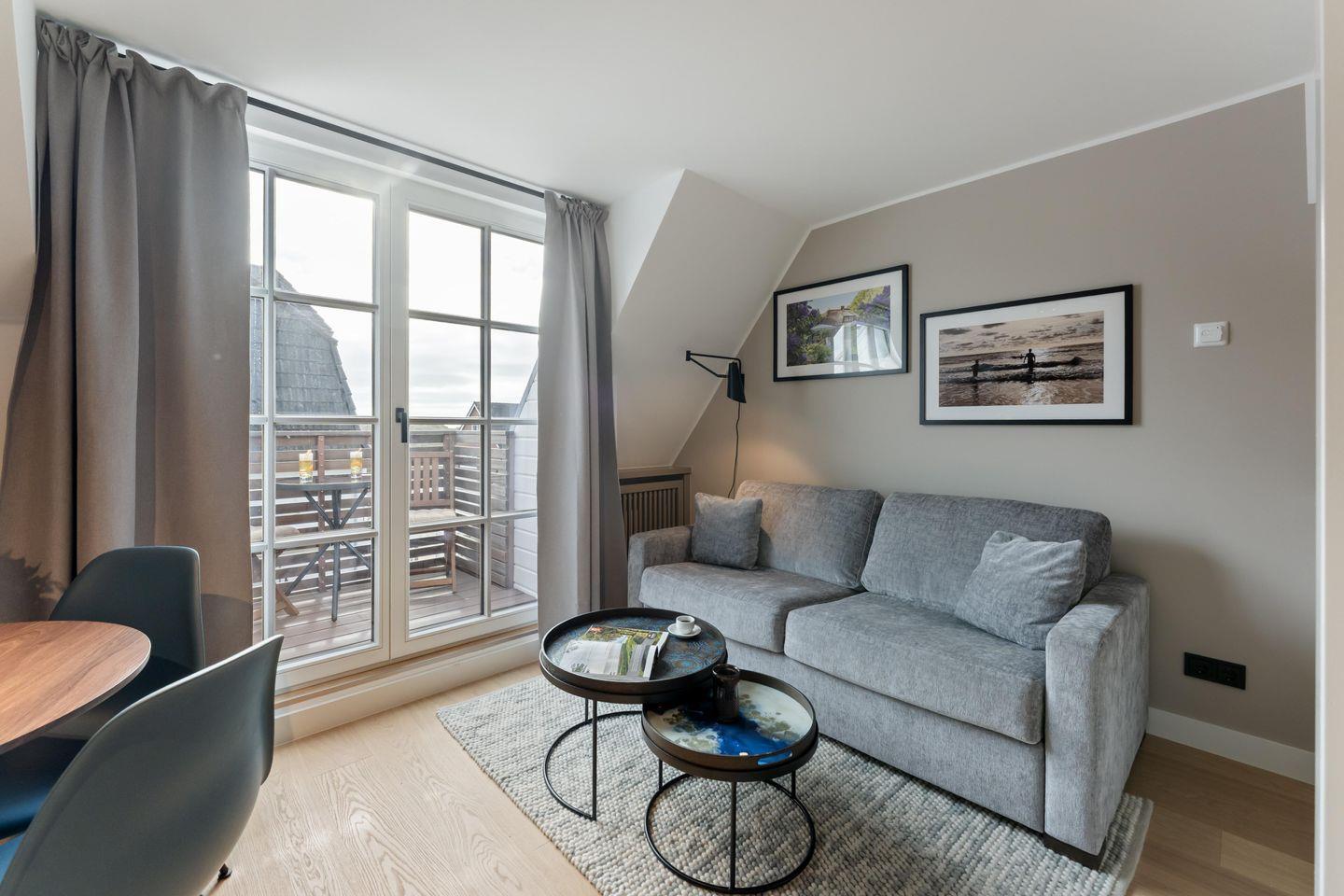 Diese charmante Ferienwohnung auf zwei Ebenen ist der ideale Rückzugsort für Paare oder Alleinreisende, die Sylt in vollen Zügen genießen möchten. Mit stilvollem, urbanem Design und durchdachter Ausstattung bietet sie auf ca. 55 qm alles, was das Urlaubsherz begehrt – inklusive Balkon mit seitlichem Meerblick und fußläufiger Nähe zum Strand.