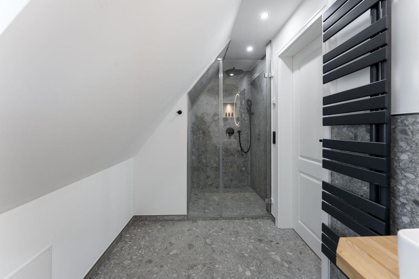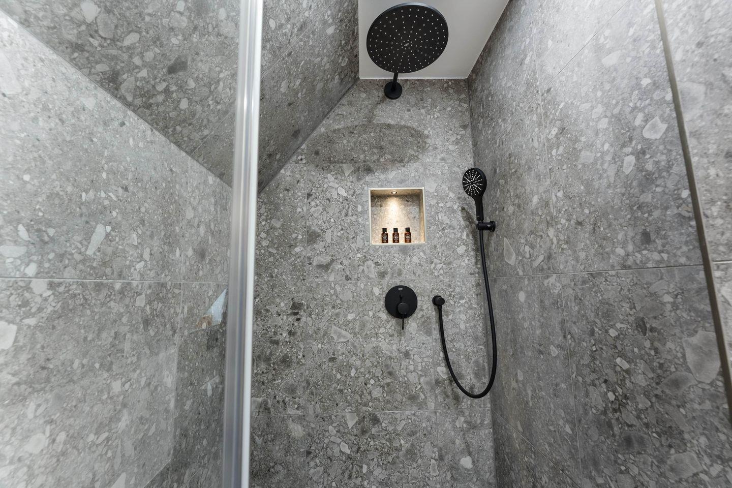Das geräumige Badezimmer mit Dusche ist modern gestaltet und bietet alles für einen erfrischenden Start in den Tag.