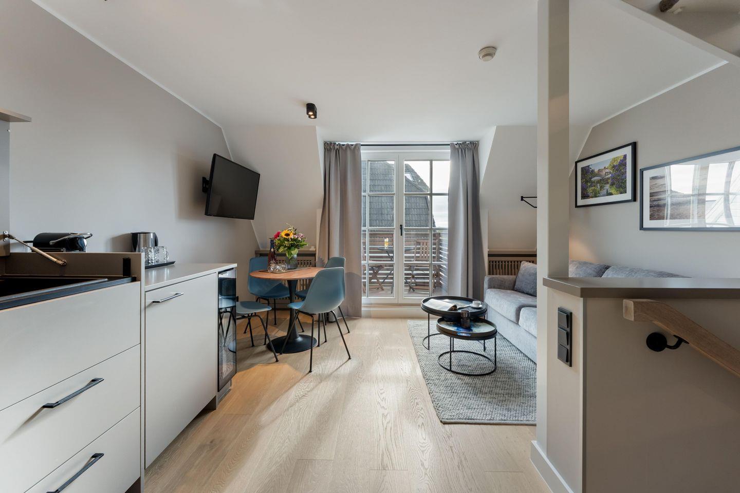 Im offen gestalteten Wohnbereich erwartet Sie eine entspannte Atmosphäre mit bequemer Schlafcouch (140x200 cm) und Flat-TV. Die harmonisch integrierte Pantry-Küche ist perfekt für kleine Mahlzeiten oder ein ausgiebiges Frühstück. Ausgestattet mit Induktionskochfeld, Weinkühlschrank, Geschirrspüler, Kühlschrank mit Gefrierfach und Nespresso-Maschine lässt sie keine Wünsche offen.