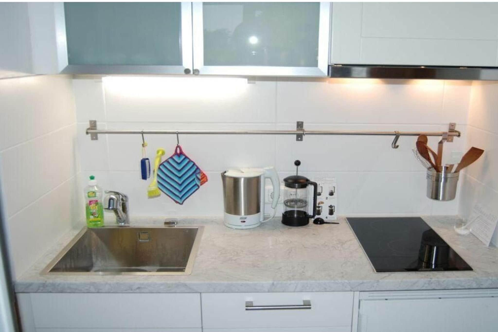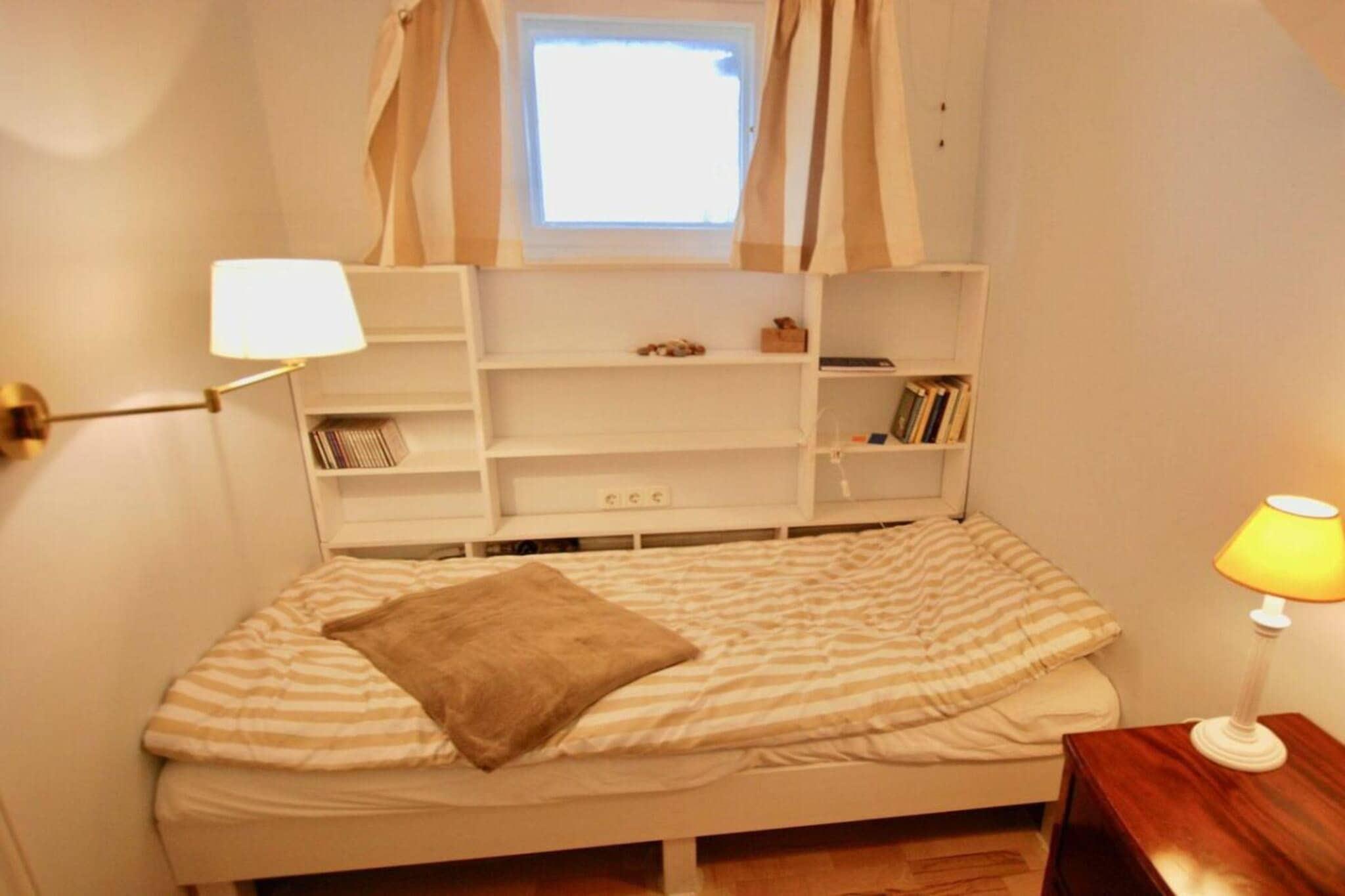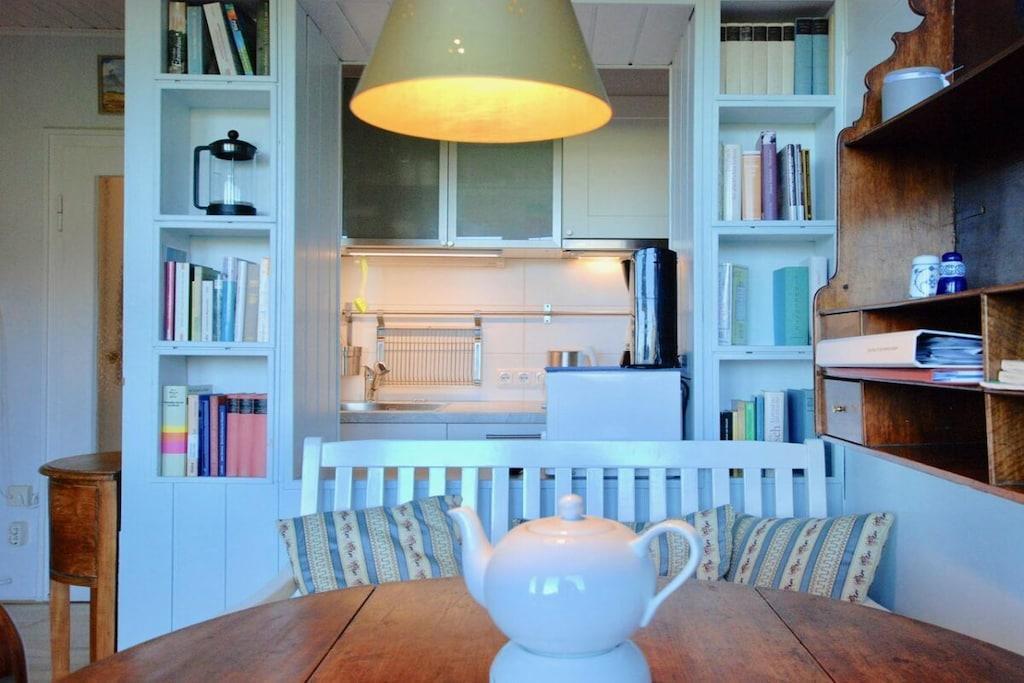 Stueetage: (entre(), åbent køkken(spisebord, elkedel, komfur, kaffemaskine, mikrobølgeovn, opvaskemaskine , køleskab), Stue/soveværelse(, , bibliotek, enkeltsovesofa, Fjernsyn, radio, stereoanlæg), Børneværelse(dobbeltseng), badeværelse(, toilet, bruser, håndvask)) , Førstehjælp, terrasse(, Strand, havemøbler)