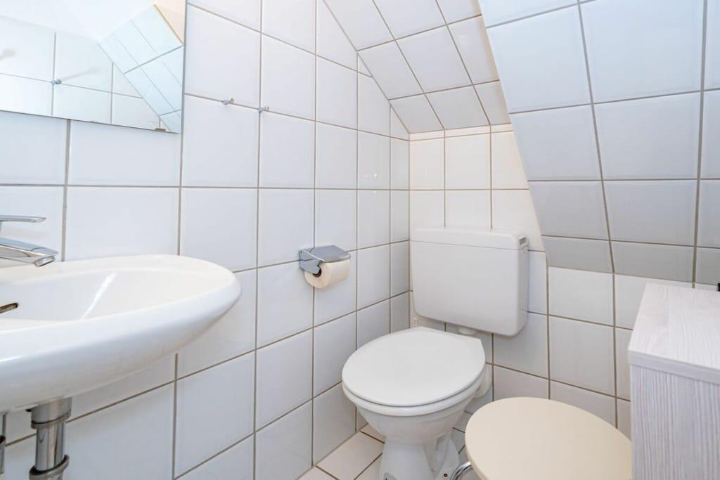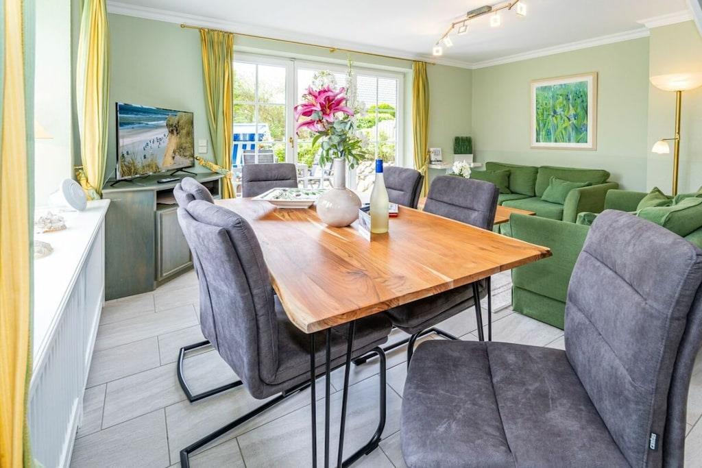Frisian House "Inselperle im Horsatal" Bright Frisian house on three levels without a basement. On the ground floor, a vestibule leads to a tastefully furnished living-dining room, the heart of the apartment, with a sofa corner and a large dining table for 6 people. The property also features underfloor heating, a cable flat-screen TV, a DVD player, a radio, a telephone, and Wi-Fi. A separate kitchen with a ceramic hob, dishwasher, oven, microwave, and refrigerator is available. A guest toilet is on the ground floor, a shower room on the first floor, and a toilet on the second floor. A Nordic white wooden staircase leads to the upper floor, where there are two bedrooms and a bathroom. The master bedroom has a double bed (2 x 90 cm wide), built-in wardrobes, a cable flat-screen TV, and a desk. The smaller bedroom has a French bed (1.50 m wide) and a built-in wardrobe. The bathroom with shower, toilet, and sink has underfloor heating. Attic with two separate beds (each 90 cm wide) and a toilet with a sink. One small dog is allowed for a fee.