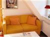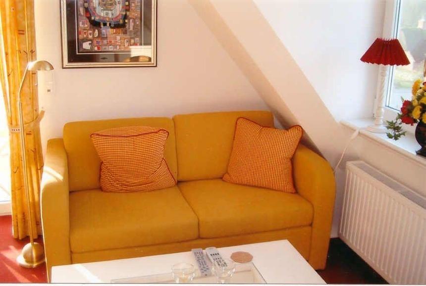 Im Obergeschoß befindet sich der sehr helle Wohnbereich mit 2 großen Fenstern (Richtg.Osten und Westen) und 2 Flügeltüren zum Balkon (Richtung Süden). Der Balkon (Südlage) ist knapp 7 m lang. Zwischen den Flügeltüren befindet sich der Eßbereich. Der gemütliche Eßbereich und die einladende Sitzecke sind modern möbliert, das Sofa läßt sich in eine Bett-Couch verwandeln und bietet einen sehr bequemen Schlafplatz für 2 Personen. Im Dachgeschoß ist das Schlafzimmer mit 2 Betten, die sich einzeln oder zusammen stellen lassen.