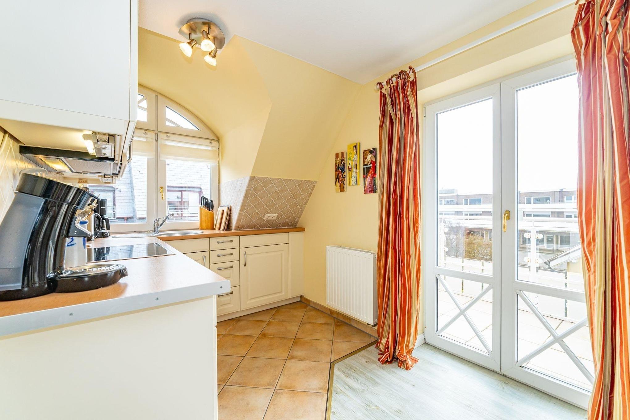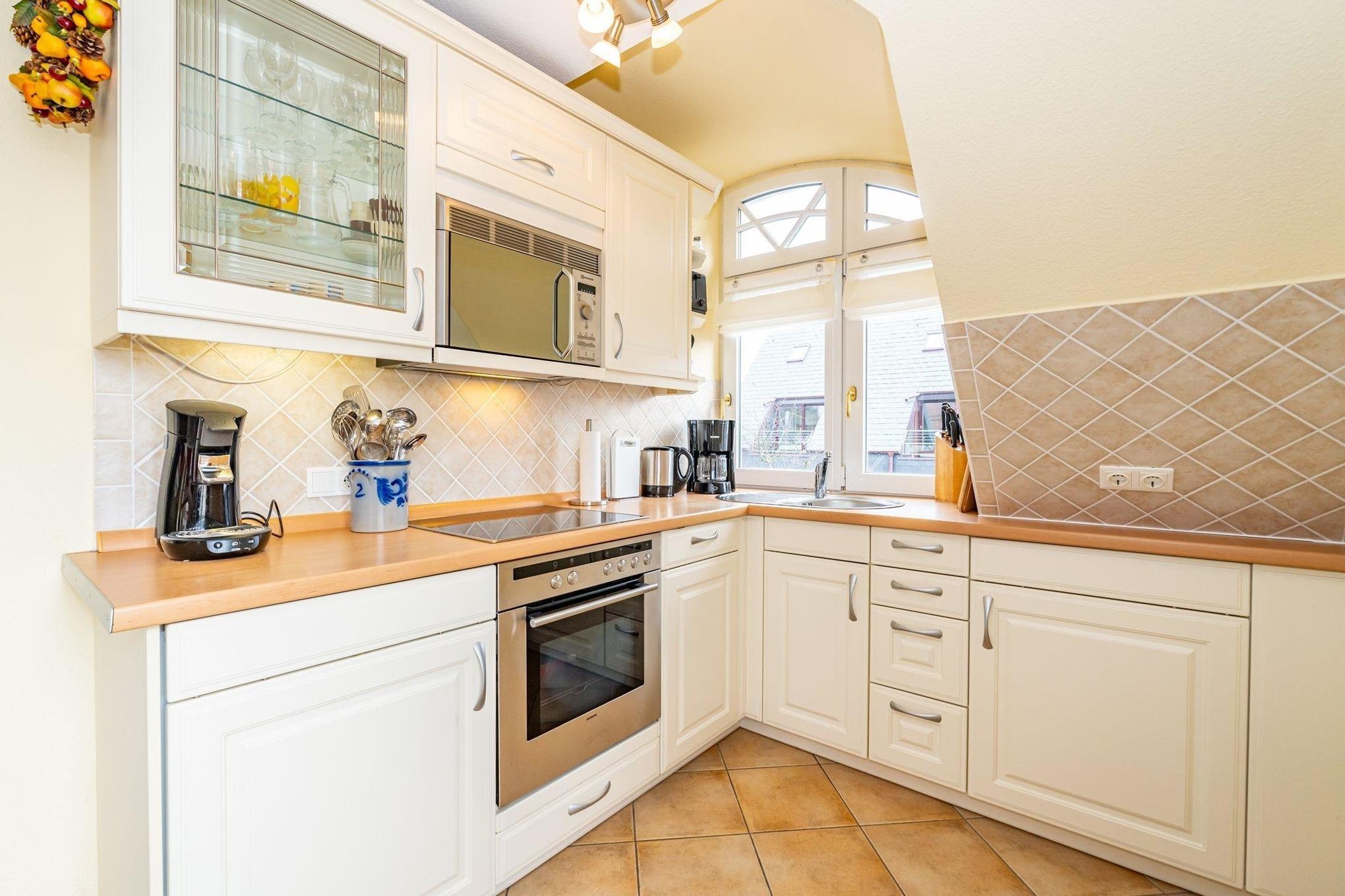 Die hochwertige Küchenzeile ist mit Geschirrspüler, Herd (mit Backofen,Koch-Ceranfeld), Mikrowelle, Dunstabzugshaube, Espresso-Maschine ausgestattet. Duschbad und WC befinden sich auf dieser Ebene.