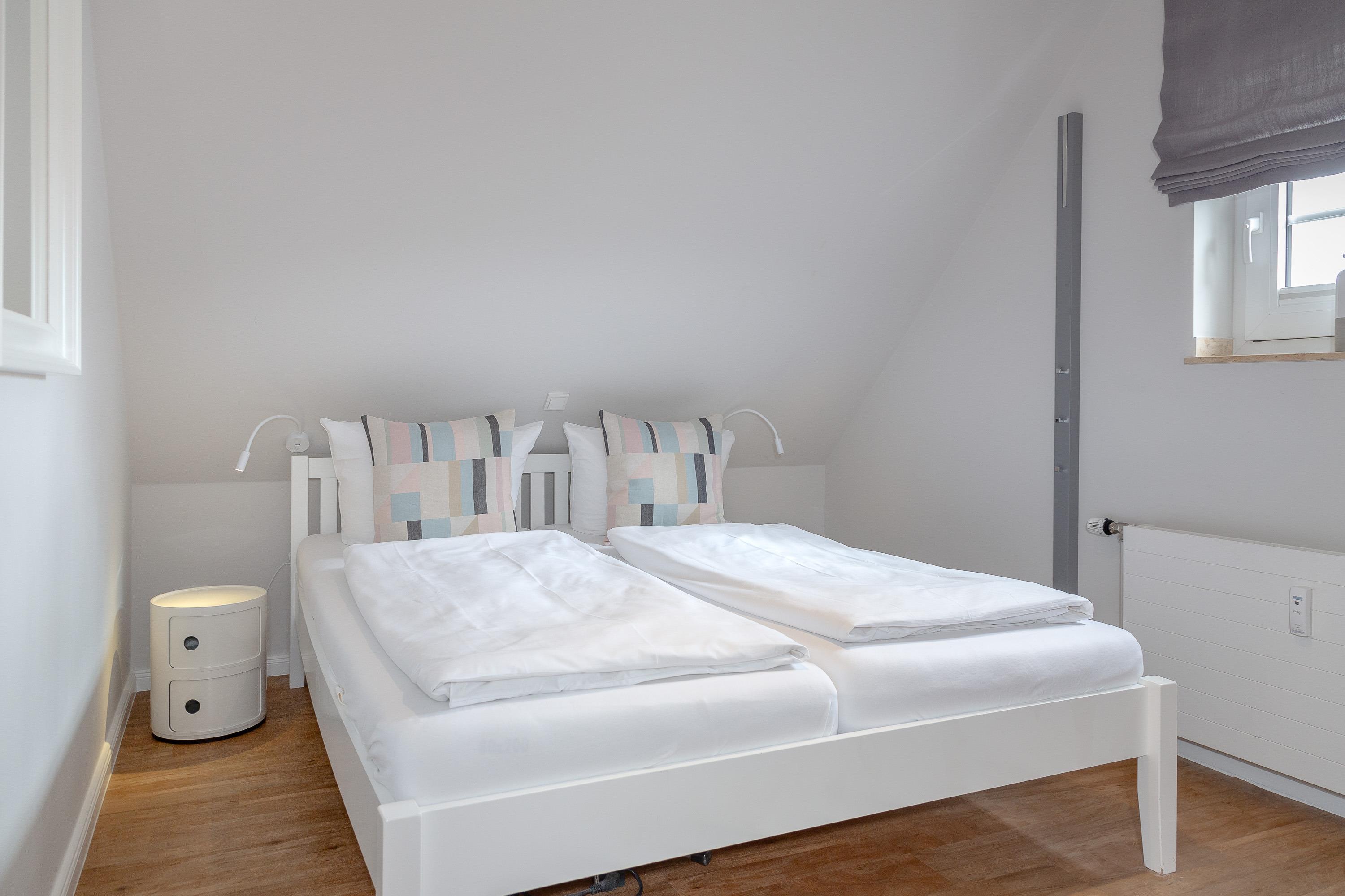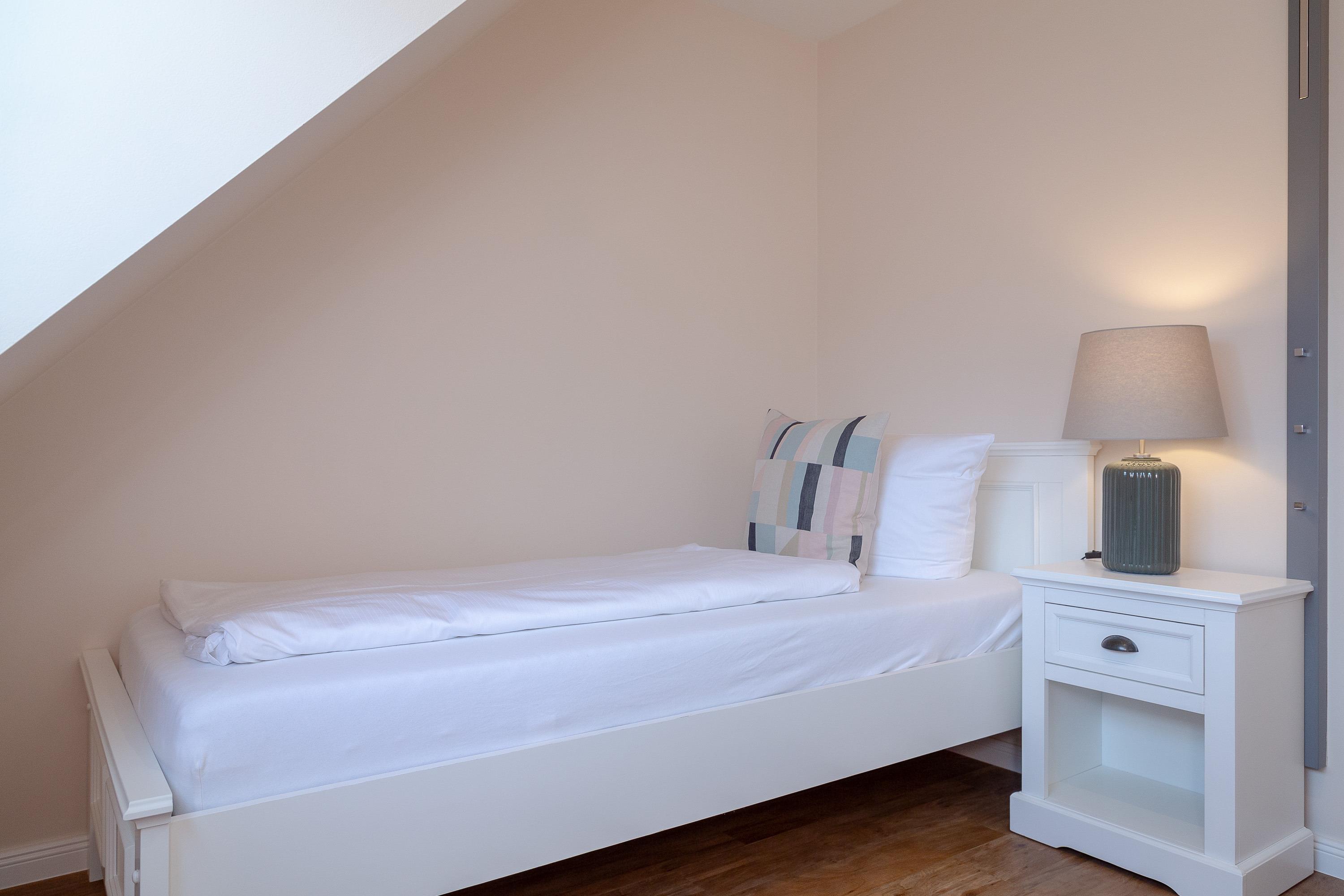 Auf gleicher Ebene zum Wohnbereich bietet Ihnen die Wohnung ein Schlafzimmer mit einem Einzelbett und ein Badezimmer mit Dusche und WC sowie noch ein separates Gäste WC. Einen weiteren Raum mit Doppelbett und Flatscreen-TV finden Sie im Dachgeschoss.