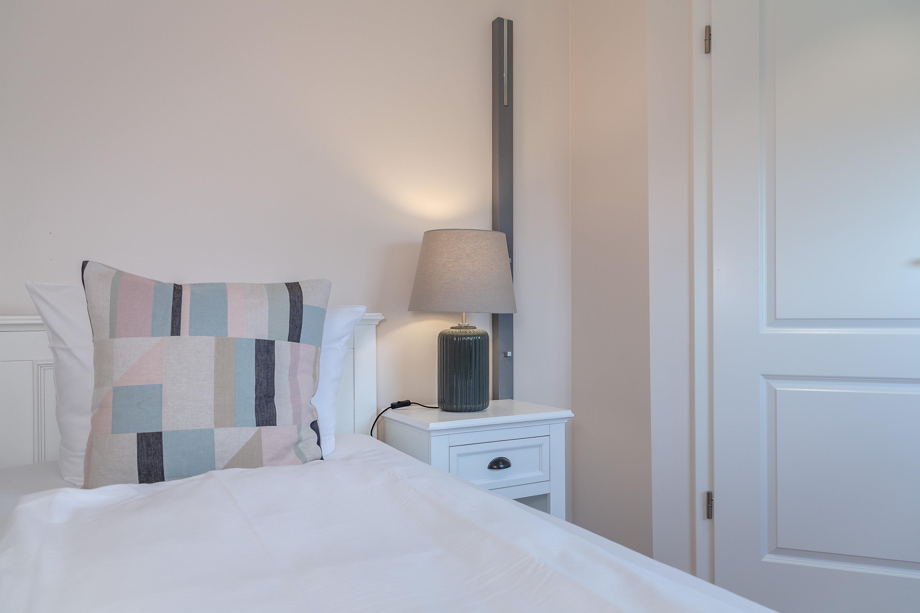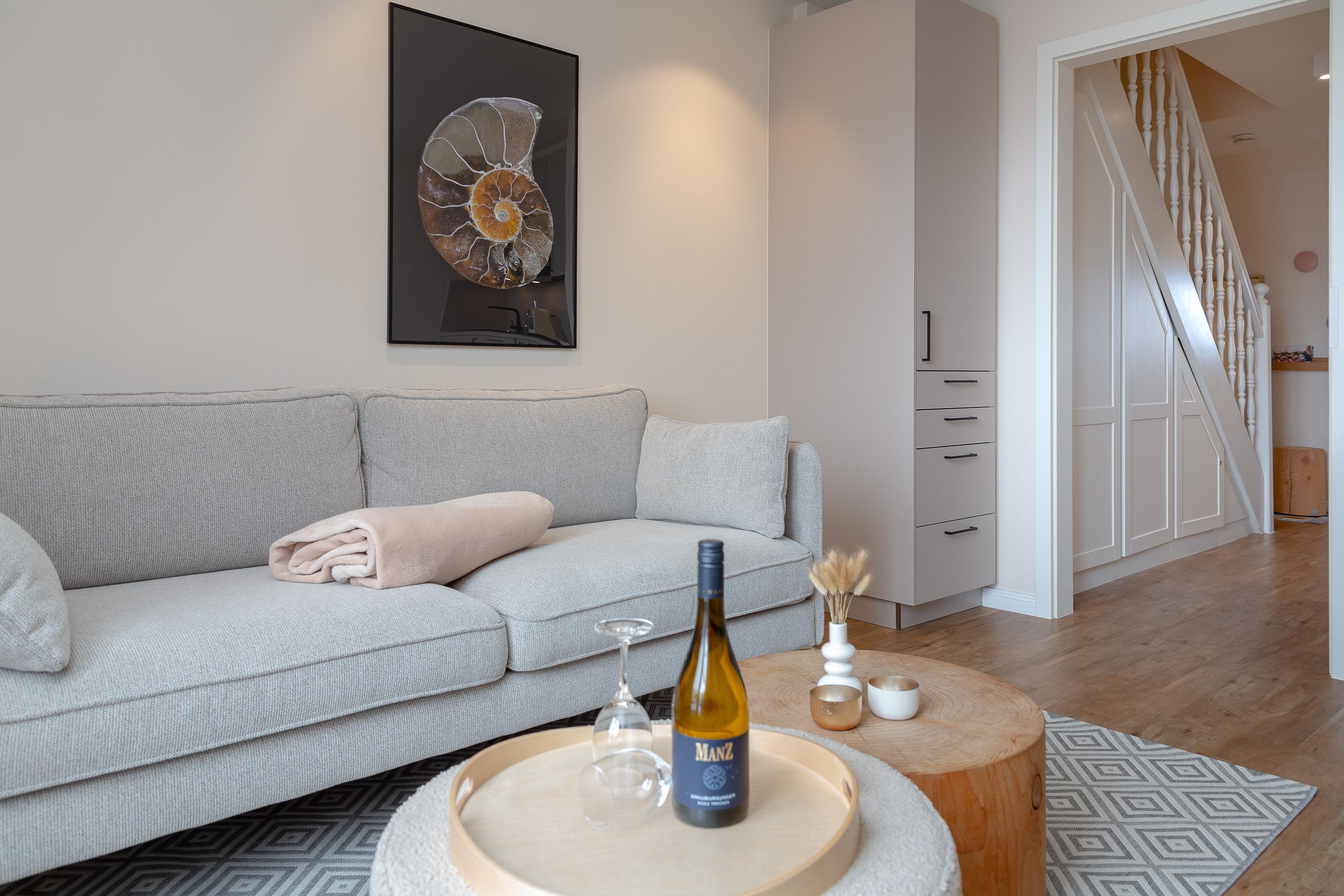 OG: Wohnbereich mit Flat-TV und WLAN, integrierte, vollausgestattete Küchenzeile mit Spülmaschine, Cerankochfeld, Mikrowelle mit Grill, Nespressomaschine, Kühlschrank mit Gefrierfach, Toaster und Wasserkocher, Schlafzimmer mit Einzelbett, Safe, Bad mit Dusche und WC, sonniger Südbalkon, eigener Strandkorb in der Sonnenkuhle