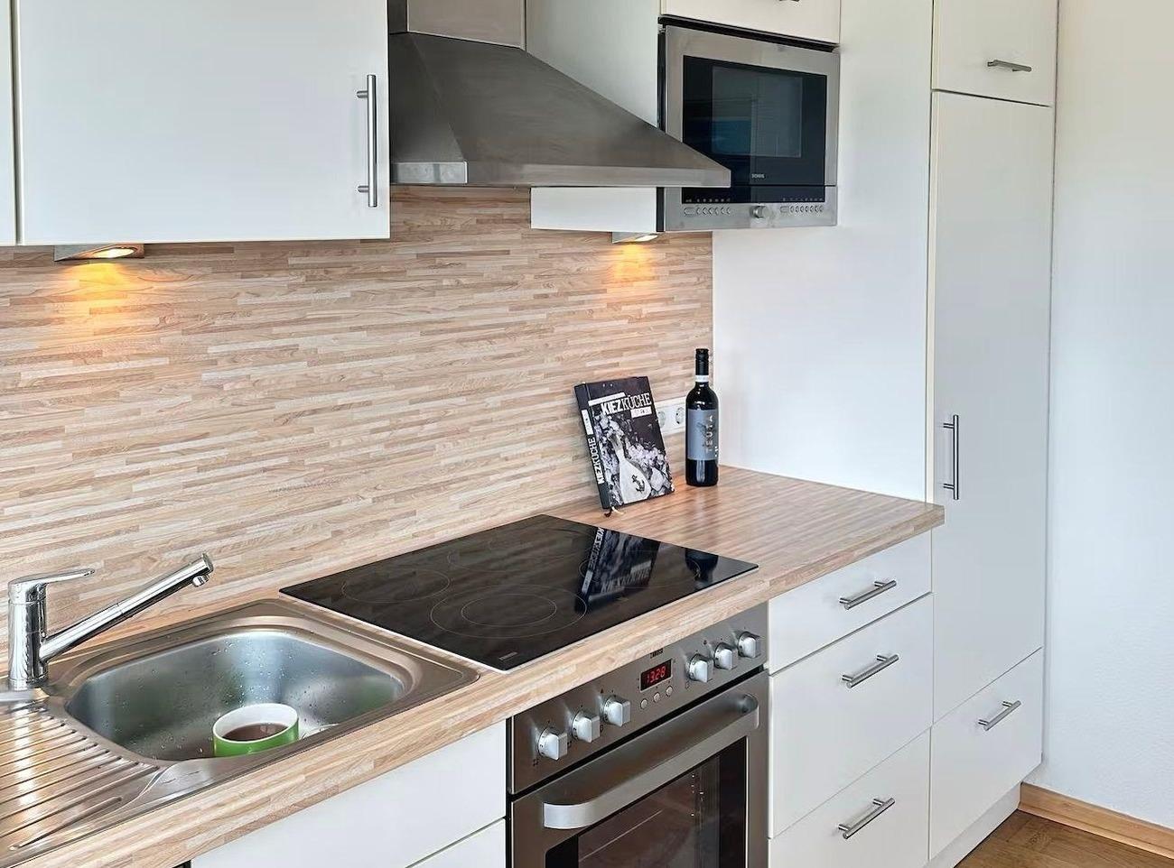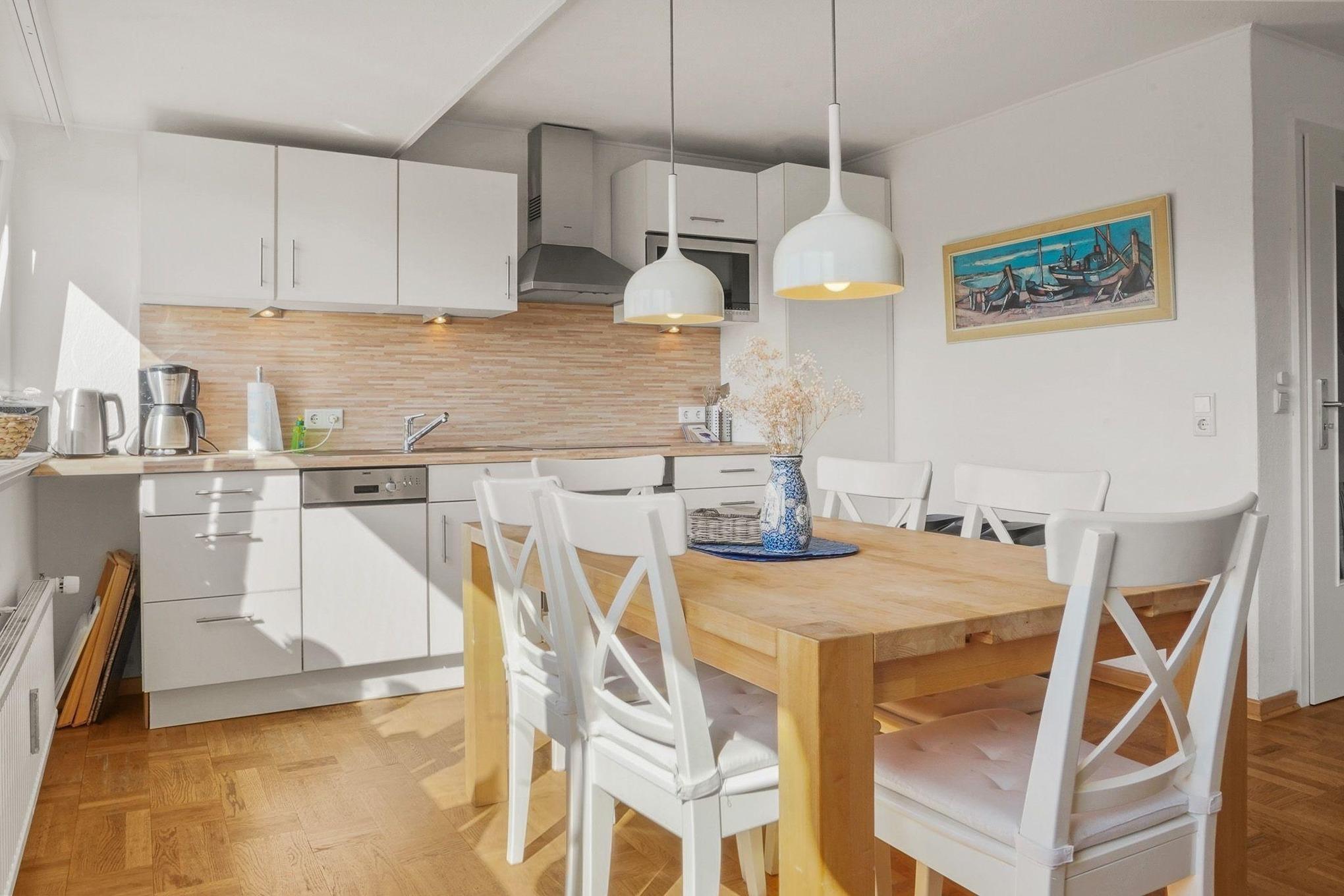 Die ab Mai 2026 komplett neu renovierte und eingerichtete Ferienwohnung empfängt ihre Gäste mit hellen, lichtdurchfluteten Räumen und einer offenen, einladenden Atmosphäre. Das gemütliche Highlight ist der großzügige Wohn- und Essbereich mit offener Küche. Hier befindet sich ein großer Esstisch für sechs Personen – perfekt für lange, gemütliche Abende. Die komfortable Sofalandschaft mit Blick auf den Fernseher und zur Küche lädt zum Entspannen ein.