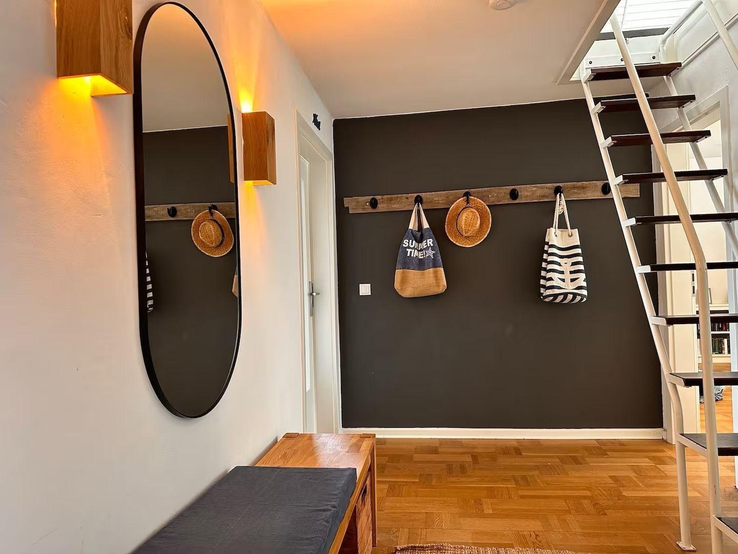 Der großzügige Flur bietet viel Platz für Jacken, Schuhe und Gepäck. Von hier aus gelangt man in das ebenfalls 2026 neu renovierte Badezimmer im nordischen Stil mit zwei Waschbecken, Dusche und WC.
