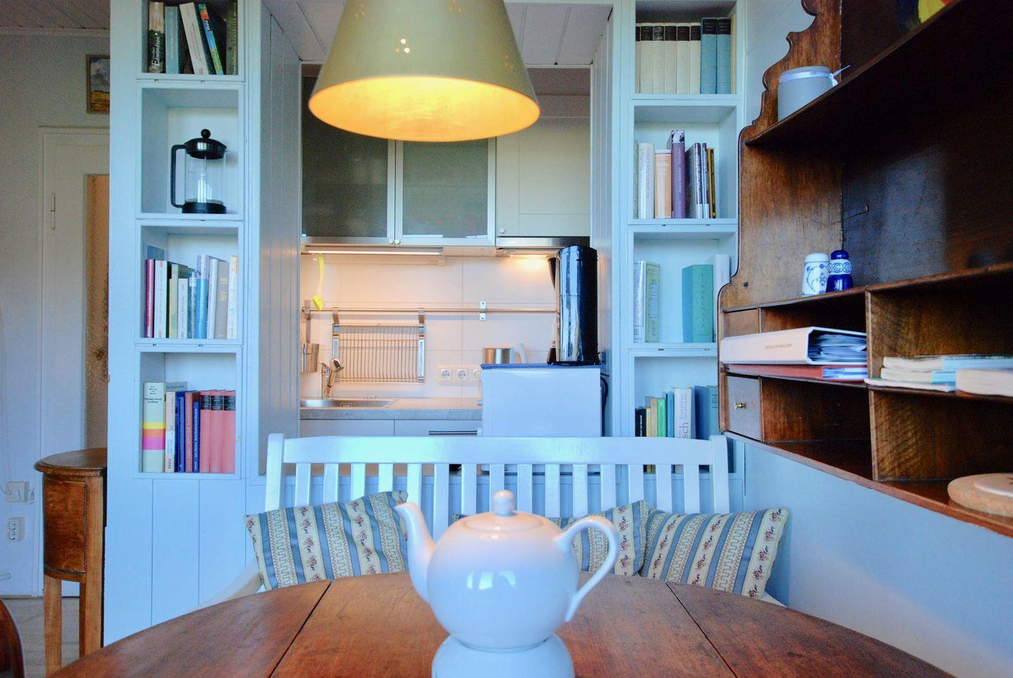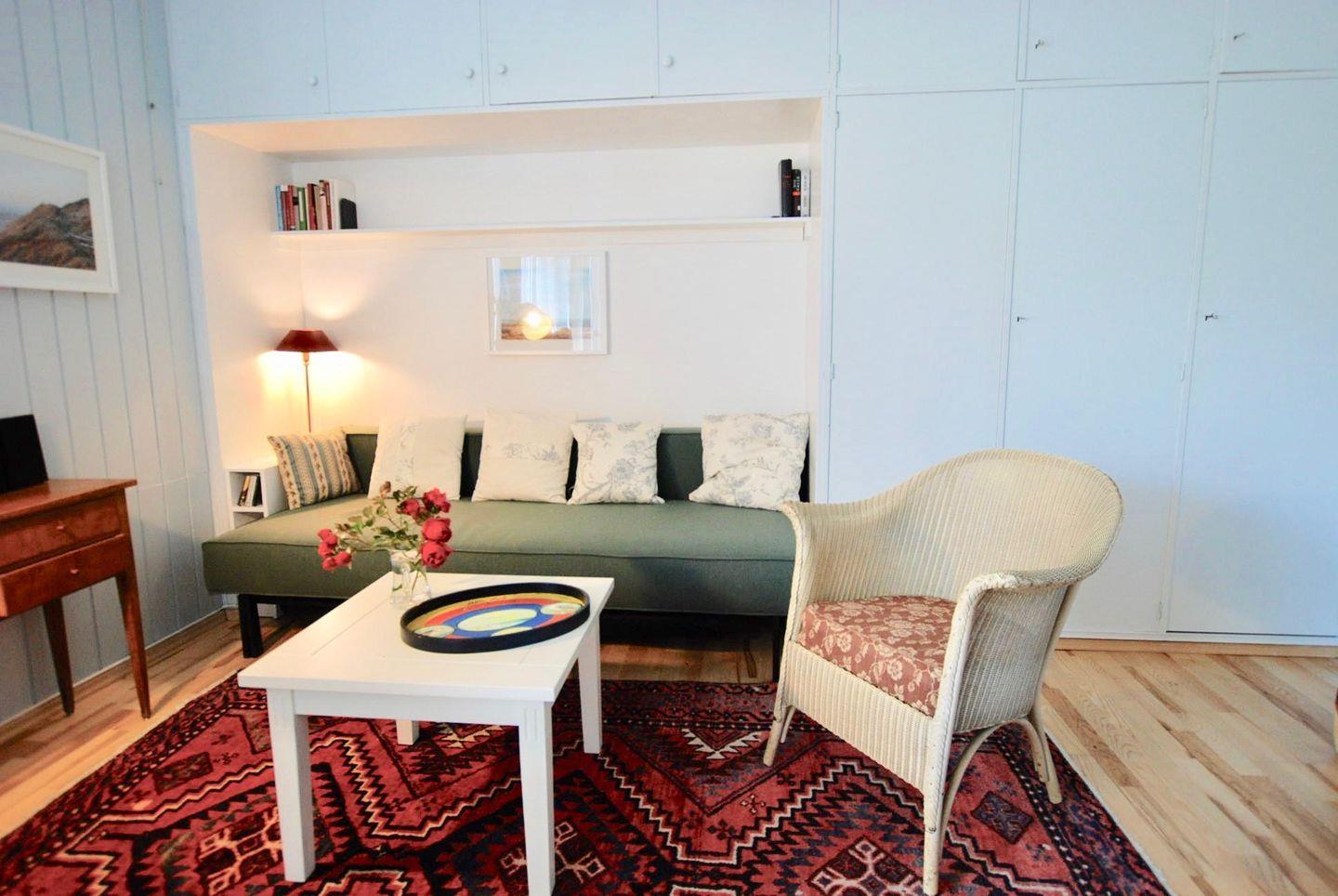 Gartenterrasse. Alle Räume haben Außenfenster oder -türen. Die Einrichtung verbindet traditionelle Wohnelemente mit zeitgemäßer Technik.