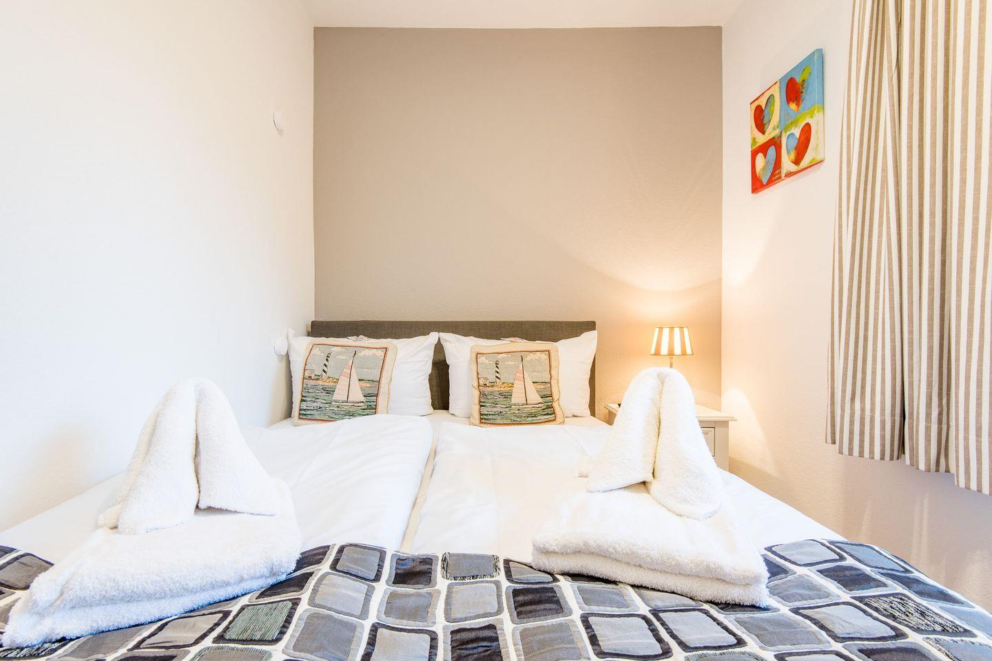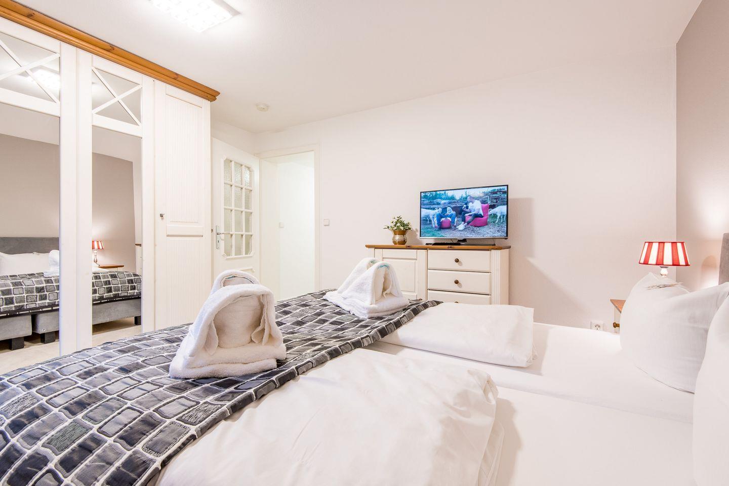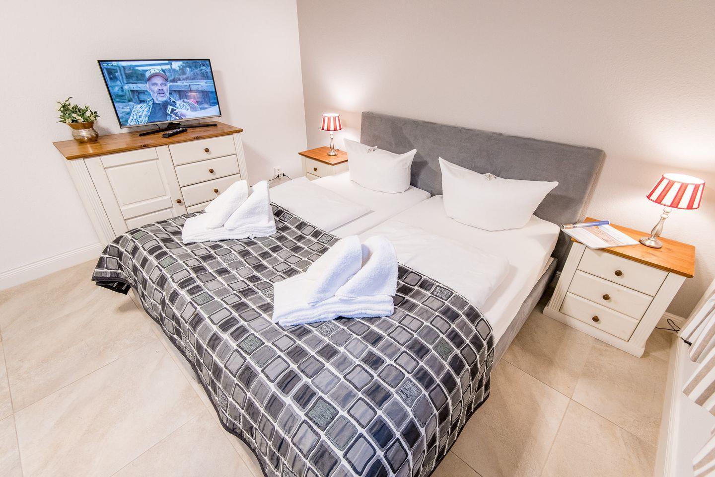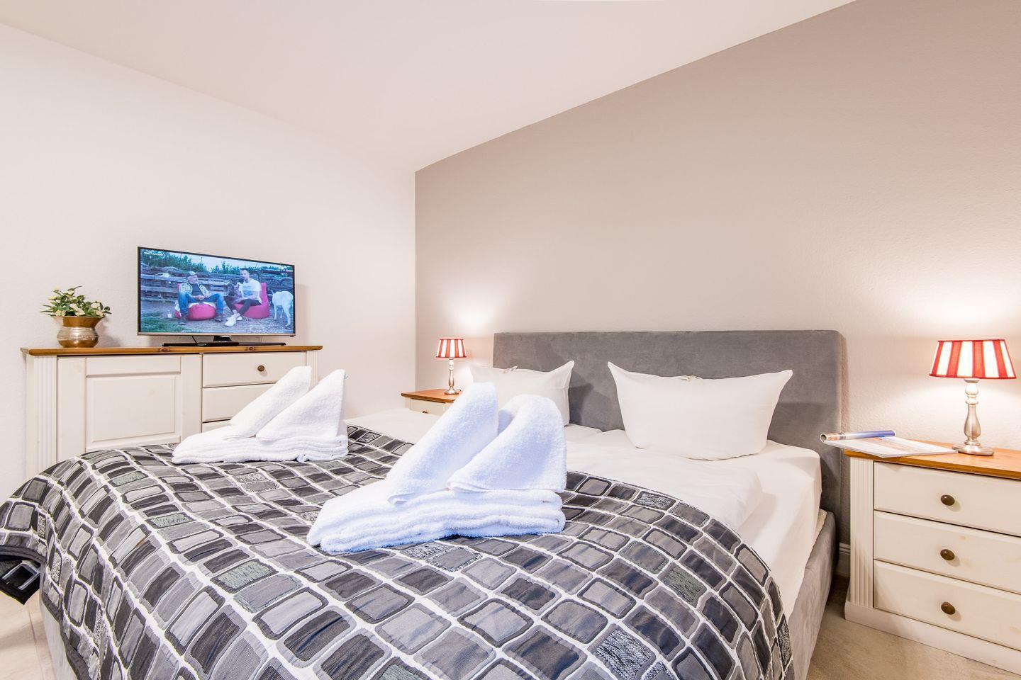Das Hauptschlafzimmer ist mit einem Boxspringbett (180x200 cm), einem Kleiderschrank und einem TV eingerichtet und bietet Ihnen eine ruhige Rückzugsmöglichkeit. Das zweite Schlafzimmer, ebenfalls mit einem Boxspringbett (140x200 cm) und TV, eignet sich ideal für eine dritte Person.