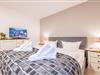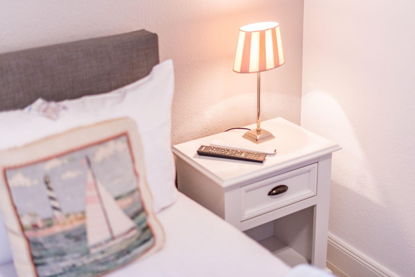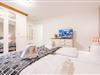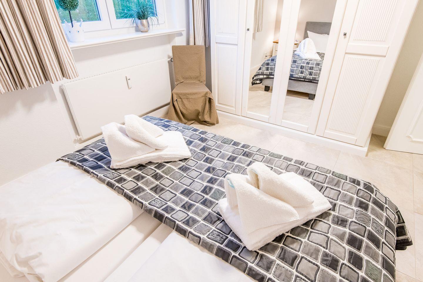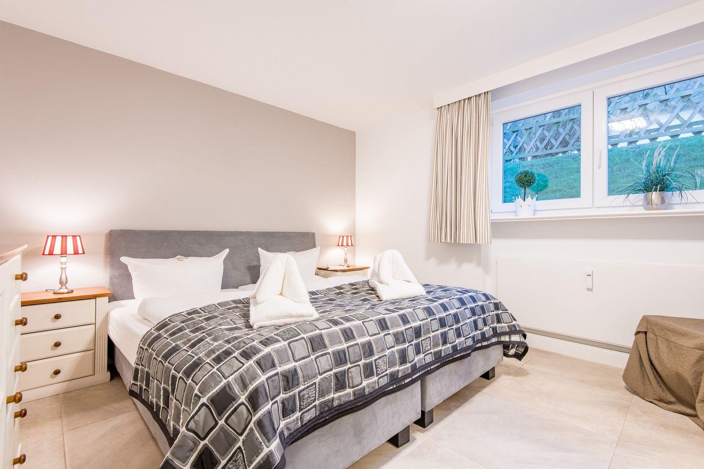 Das Hauptschlafzimmer ist mit einem Boxspringbett (180x200 cm), einem Kleiderschrank und einem TV eingerichtet und bietet Ihnen eine ruhige Rückzugsmöglichkeit. Das zweite Schlafzimmer, ebenfalls mit einem Boxspringbett (140x200 cm) und TV, eignet sich ideal für eine dritte Person.